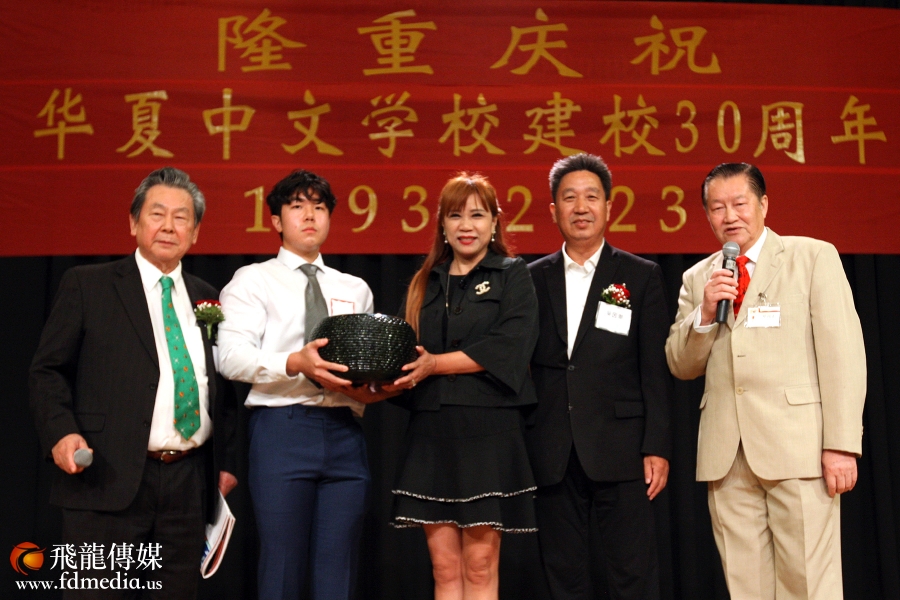 当天的晚宴上,还举行了隆重的颁奖仪式,前理事长张宪宽为华夏中文学校的发起人李文彦、杨家骅、常湘滨三位先生,颁发了特别纪念奖。以感谢他们为华夏中文学校的创立作出的杰出贡献。晚宴主席包华富特邀周虹参赞为前理事长朱丽、总校长马莎和贾忠老师颁发了特别贡献奖,以表彰他们为华夏的发展作出的努力。糖城分校校长黄玲为华夏的两位同学颁发了华夏三十周年校庆T恤设计奖。此外,还为退休理事、退休教职员工和分别服务华夏五年、十年、十五年、二十年以上的教职员工及理事颁发了感谢奖。晚宴主席包华富为华夏服务超过二十五年的常务副校长关丽华、中文老师王兴平以及前理事长唐艺杰颁发了感谢状,特别感谢他们用四分之一个世纪的时光奉献给了华夏中文学校,赢得了全场崇高的敬意和热烈掌声。