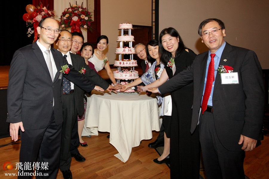 包华富主席、陈宇雯理事长特邀周虹参赞以及部分理事共同切开了“庆祝华夏中文学校三十周年”的六层大蛋糕,象征着华夏今后发展“六六大顺”。