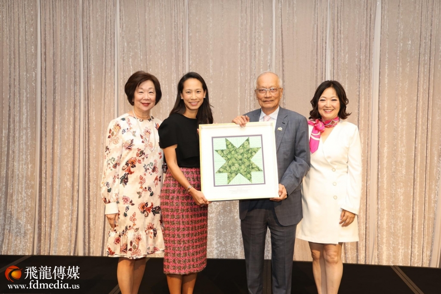 Theresa Chang董事會主席和Linda Wu副主席為吳文龍董事長頒獎!吳董事長女兒Janae Tsai上臺陪同領獎。