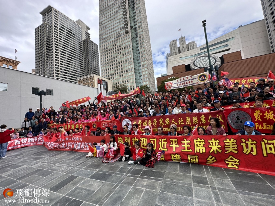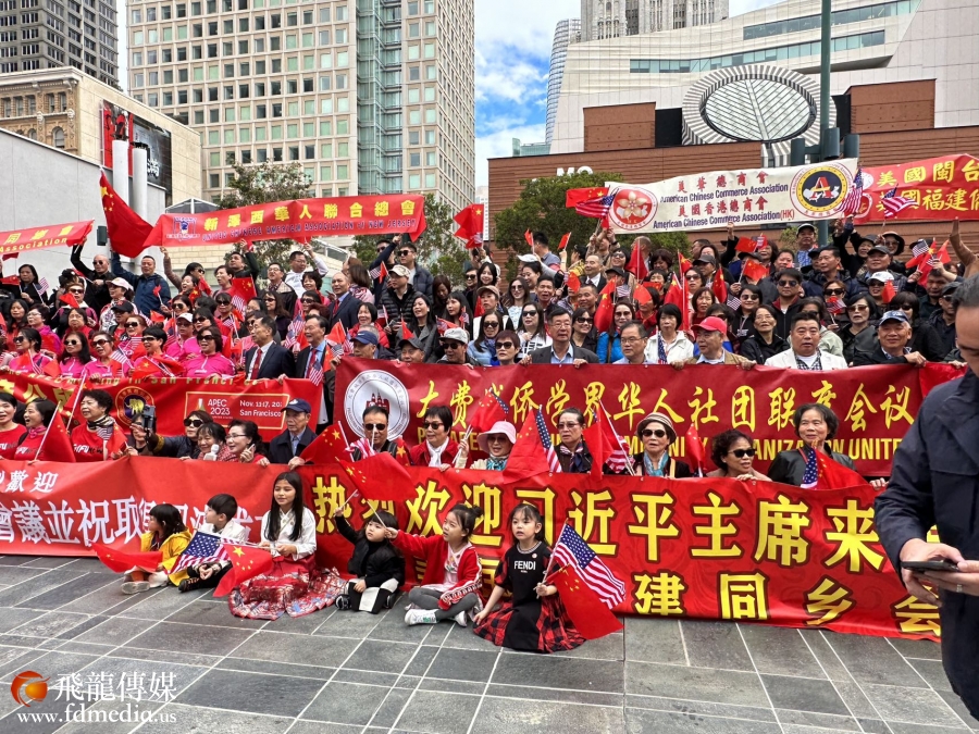 为了迎接习近平主席的到来,旧金山华侨华人及各华人社团在习近平主席经过的路线和下榻的宾馆旁,大排长龙拉着欢迎习近平主席的横幅,高举五星红旗和美国国旗,义勇军进行曲响彻云霄,这是华侨华人表达对祖(籍)国的亲人最热烈的欢迎。