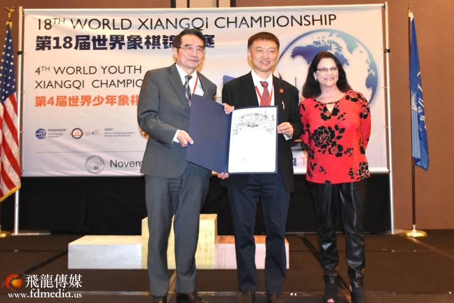 世界象棋锦标赛继乒乓球世锦赛后,在休斯敦举办的又一个世界级赛事,得到休斯敦各界的关注与支持!休斯敦体育管理局首席执行官Janis Burke参加闭幕式,她还带来了休斯敦市长Sylvester Turner 的褒奖状。休斯敦是美国第四大城市,也是一个多民族融合的城市,希望更多的世界级大赛来休斯敦举办,促进文化交流与体育交流,加深人们之间的友谊。