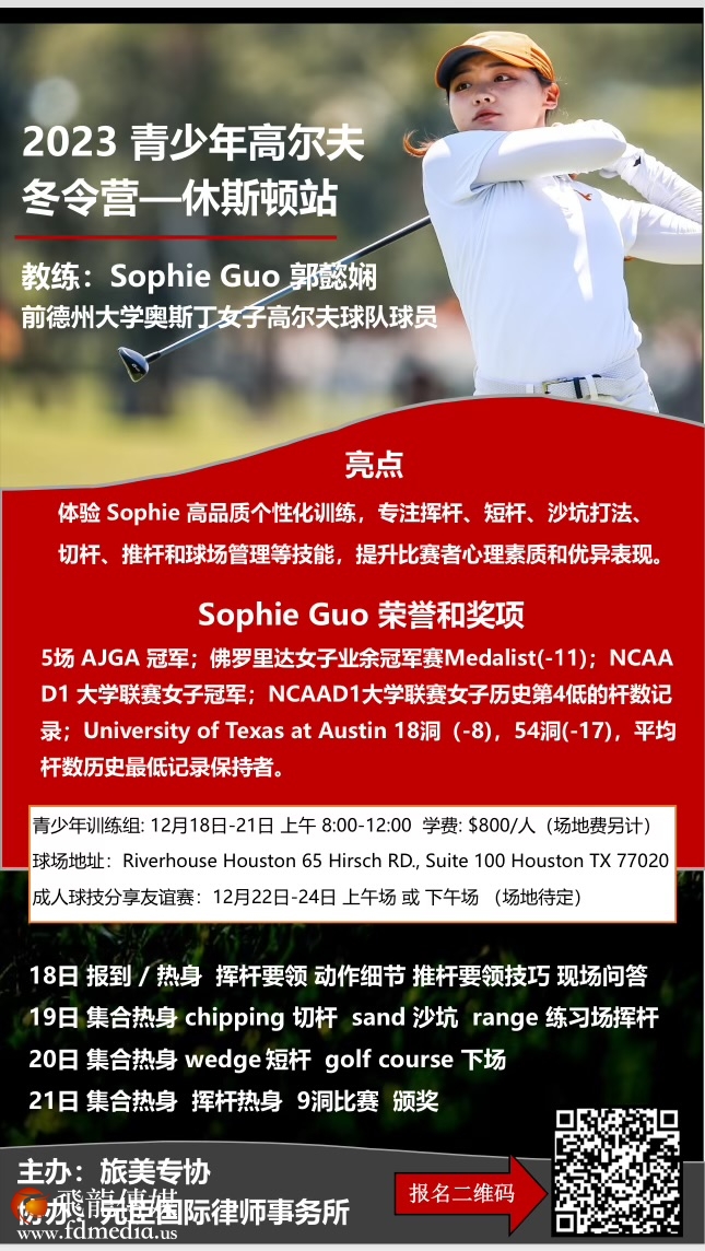 “2023 青少年高尔夫冬令营—休斯顿站”将于12月18日-21日在休斯顿举行,训练时间是每天上午8点-12点为青少年组,届时您将体验 Sophie 高品质个性化训练,专注挥杆、短杆、沙坑打法、切杆、推杆和球场管理等技能,提升比赛者心理素质和优异表现。请按下方二维码报名注册。