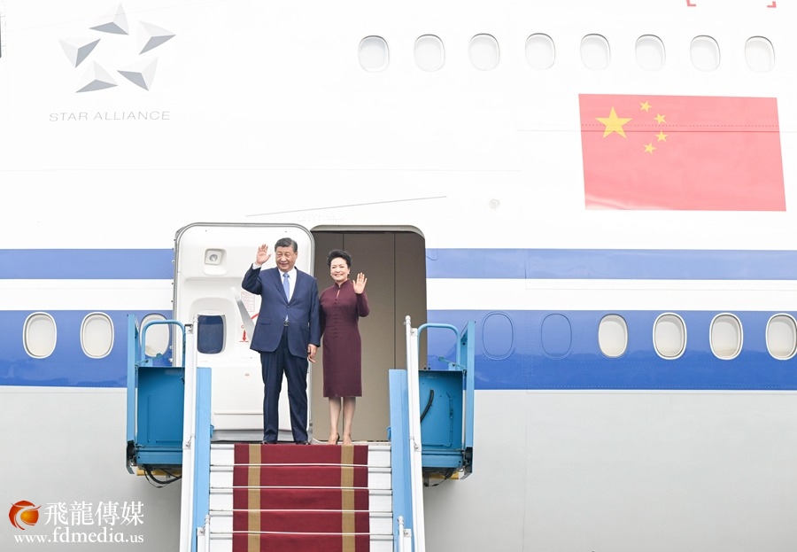 习近平主席夫人彭丽媛,中共中央政治局常委、中央办公厅主任蔡奇,中共中央政治局委员、外交部部长王毅,中共中央书记处书记、公安部部长王小洪等陪同人员同机抵达。