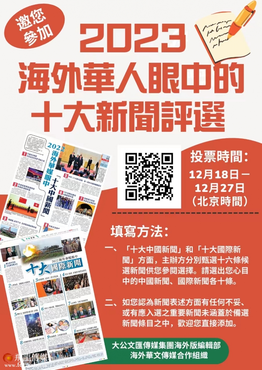 “2023海外华人眼中的十大新闻评选活动” 增添了网络评选渠道,诚邀海外华文媒体,以及读者朋友能够参与其中。
