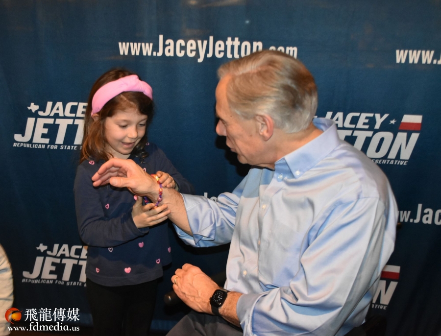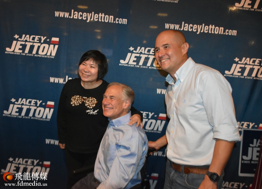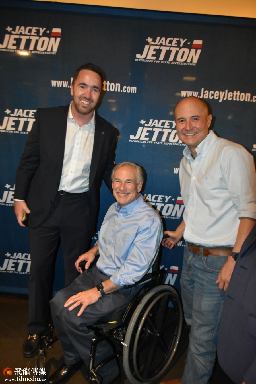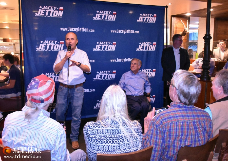 在1月11日竞选活动中,州长格雷格·阿博特亲临休斯敦为杰西(Jacey Jetton)站台。