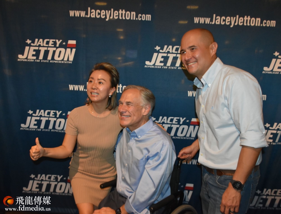 国会议员代表张晶晶与州长格雷格·阿博特、杰西合影。