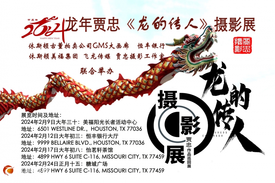 为给2024这个龙年的春节增添一些“龙文化”的色彩,由休斯顿古董拍卖公司GMS大画廊、恒丰银行、休斯顿美福集团、飞龙传媒和贾忠摄影工作室联合举办的“2024龙年贾忠《龙的传人》摄影展”,将于2月9日大年三十,在美福阳光中心正式来开帷幕。