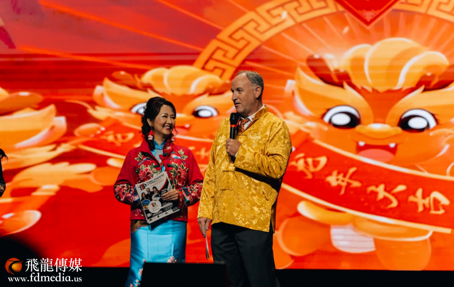 开场歌舞后本次晚会主持人杨婷、王松梅、Eric Zhao、Michael Hanschen闪亮登场!四位主持人优雅知性、落落大方。在他们的隆重介绍下,主办方天利文化基金会会长佟天乐和基金会主席Bruce Nordstrom登上舞台做了热情洋溢的致辞,佟天乐会长特意坚持在台上宣读了所有赞助商的名字,对他们大力支持本次春晚活动表示最真挚的感谢!特别是恒丰银行。她们是本次晚会最大的赞助商,今天有两位行长Jessie Lee和Sally Chiang出席了我们的晚会。