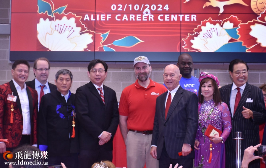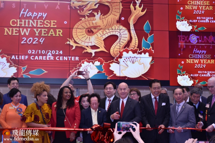 美南新闻董事长李蔚华致辞,他感谢社会各界对美南新闻的支持,在龙年来临之际祝大家新年快乐!随后贵宾们一起上台剪彩,现场充满喜庆和浓浓的年味。