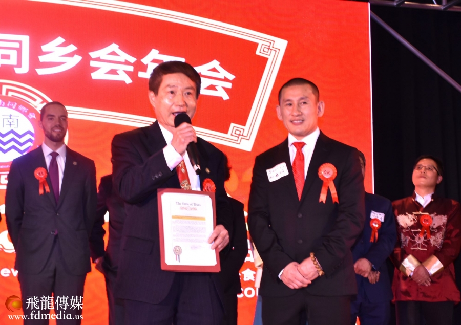 这是一个喜庆的时刻,大家齐聚一堂,共同见证河南同乡会会长杨宝华把大印交给新任会长刘根明。市长John Whitmire (约翰·惠特麦)特别颁发褒奖状,并定2月11日为休斯敦河南同乡会日,州议员吴元之亲临现场,并用中文恭贺新年,恭喜发财!斯坦福市议员谭秋晴、休斯敦第5区警长候选人杰瑞·罗德里格斯(Jerry Rodriguez)、财务总监克里斯·霍林斯(Chris Hollins)、国会议员代表张晶晶、国际区区长李蔚华、亚商会前会长喻斌、市政府社区协调员芮久玟(Joanna)、中国人活动中心前董事长陈灼刚、中心执行长方一川、前执行长杨德清等休斯敦各界名流,政商代表及河南老乡600多人参加庆祝龙年晚宴。