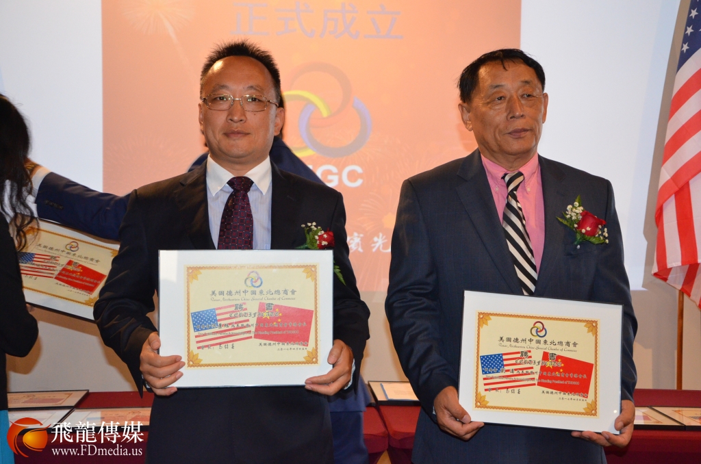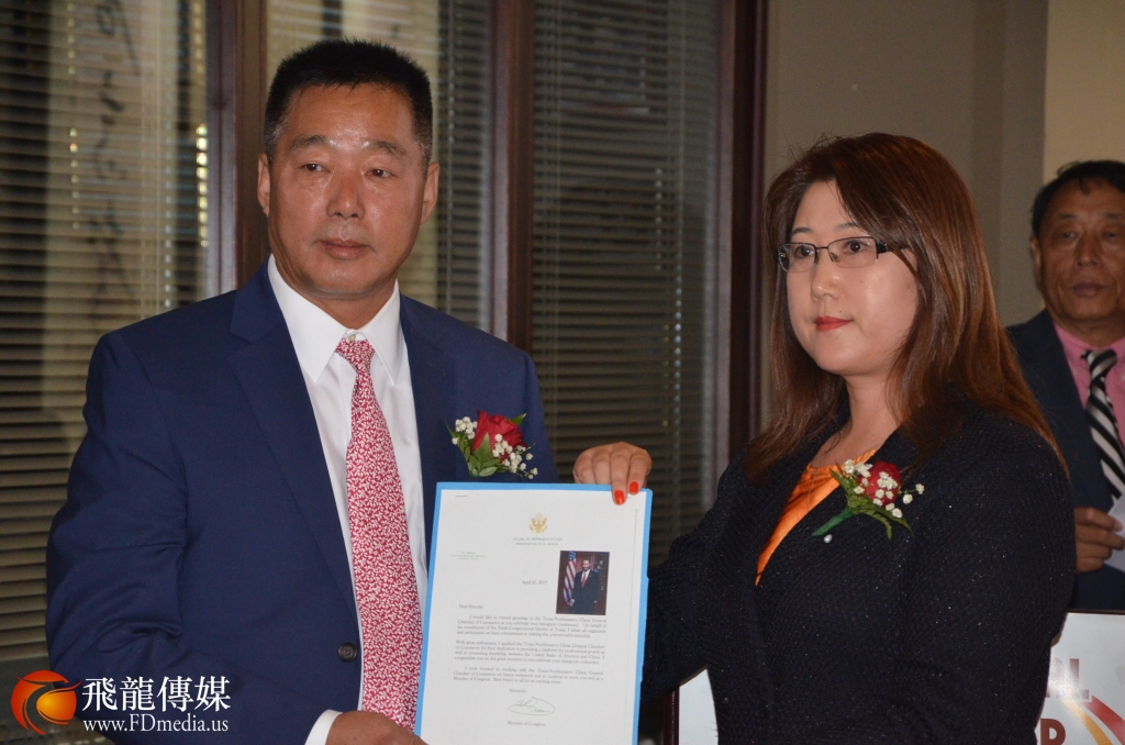 国会议员Al Green发来贺电,由商会常务副会长刘妍(右)代为转发给高绪春会长(左)。