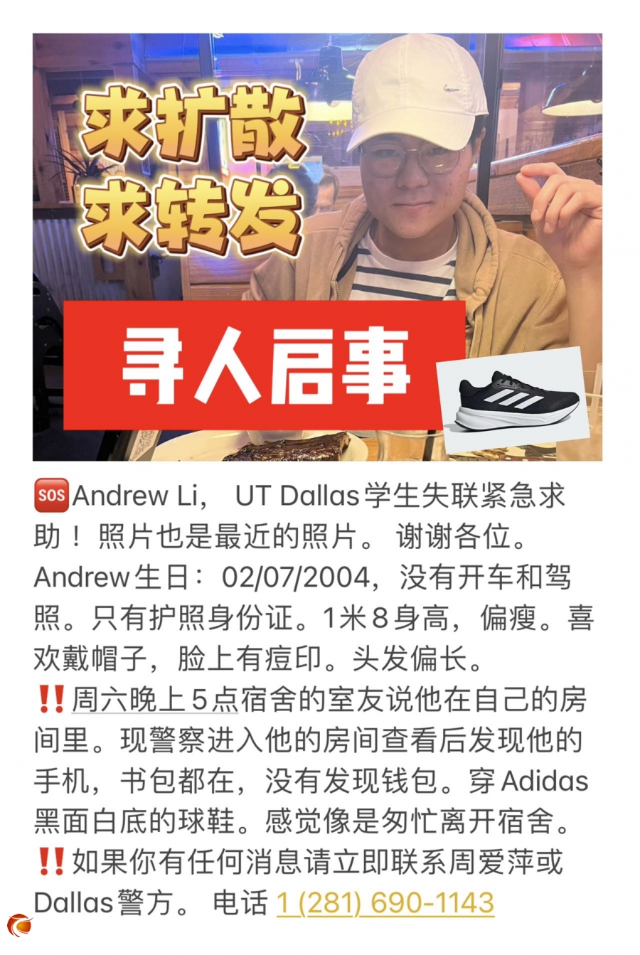 请大家帮忙UT Dallas的华裔学生失联紧急求助! 作者 小珑 发布 2024-02-27 15:12:24 浏览 5197 请大家帮忙UT Dallas的华裔学生失联紧急求助!UT Dallas的华裔学生失联紧急求助!UT Dallas的华裔学生Andrew Li自上周六晚上5点失联, 目前没有任何信息. 警方已介入。紧急求助各位朋友,尤其是达拉斯的朋友,如果你有任何消息请立即联系周爱萍或Dallas警方。 电话 1 (281) 690-1143Andrew li 出生于02/07/2004,没有开车和驾照。只有护照身份证。1米8身高,偏瘦。喜欢戴帽子,脸上有痘印。头发偏长。着Adidas 黑面白底的球鞋。谢谢大家!