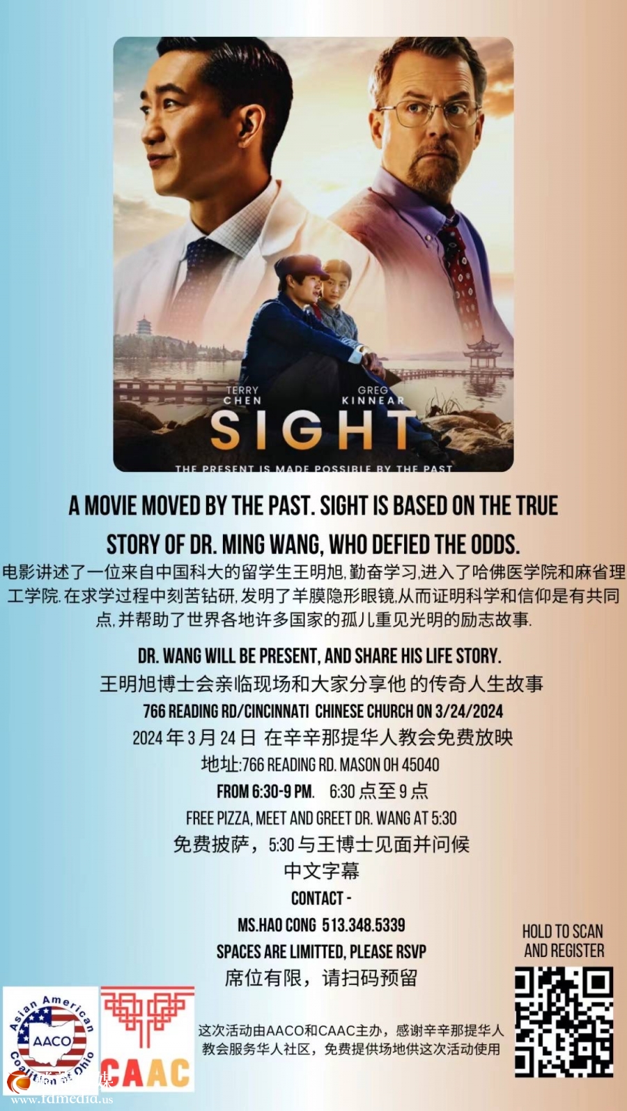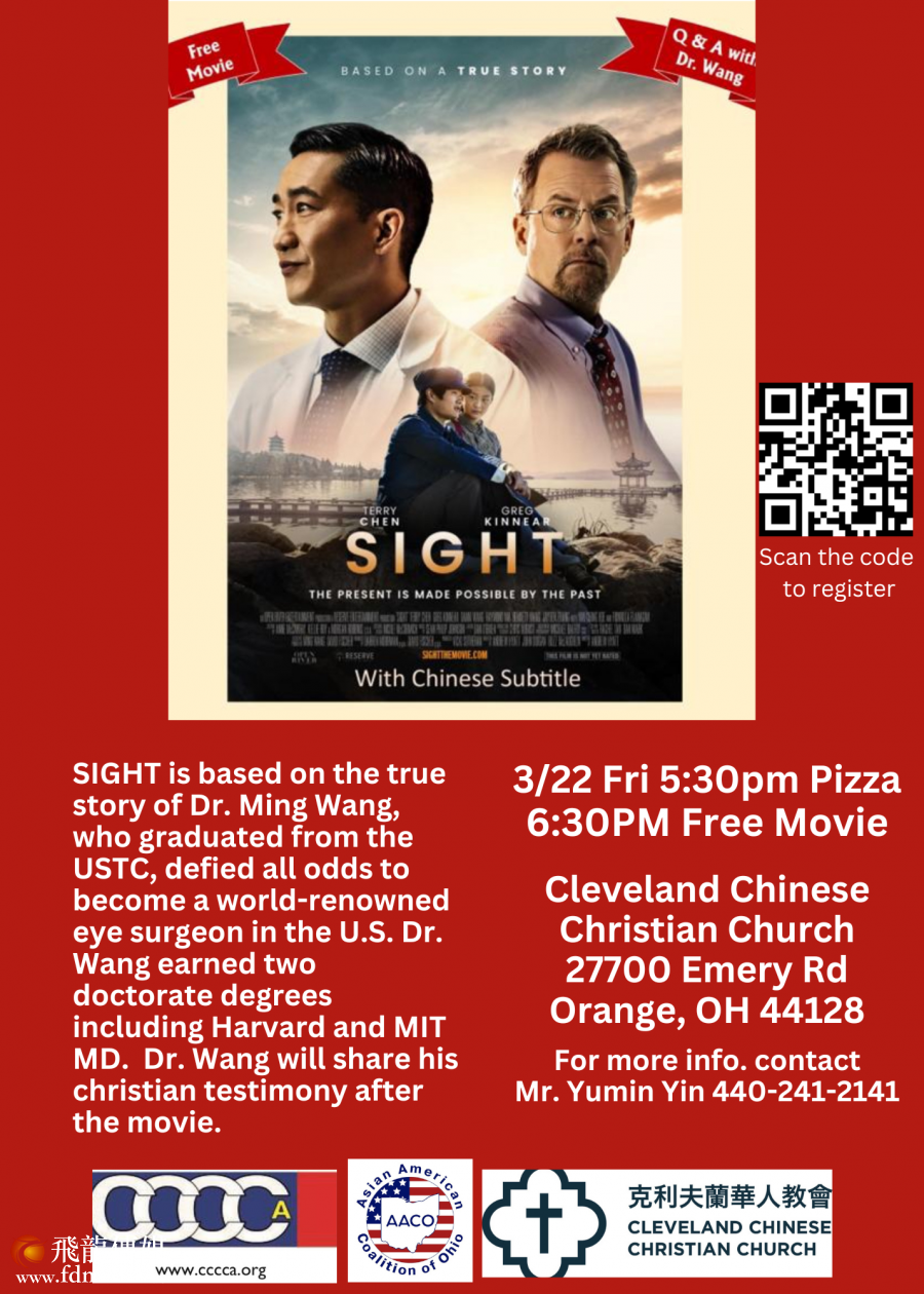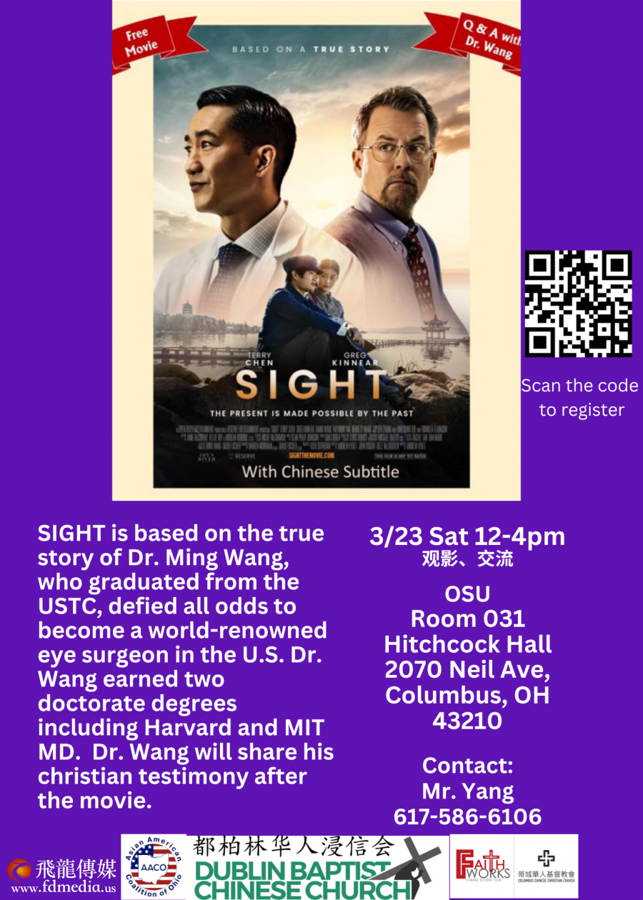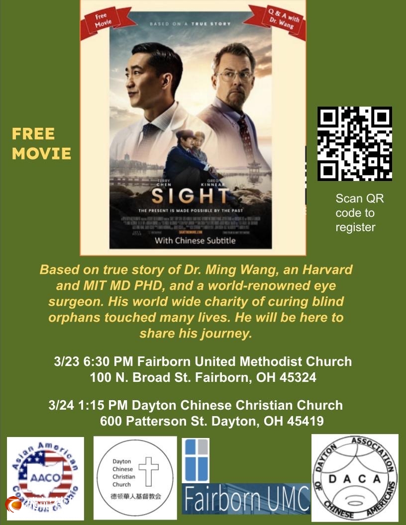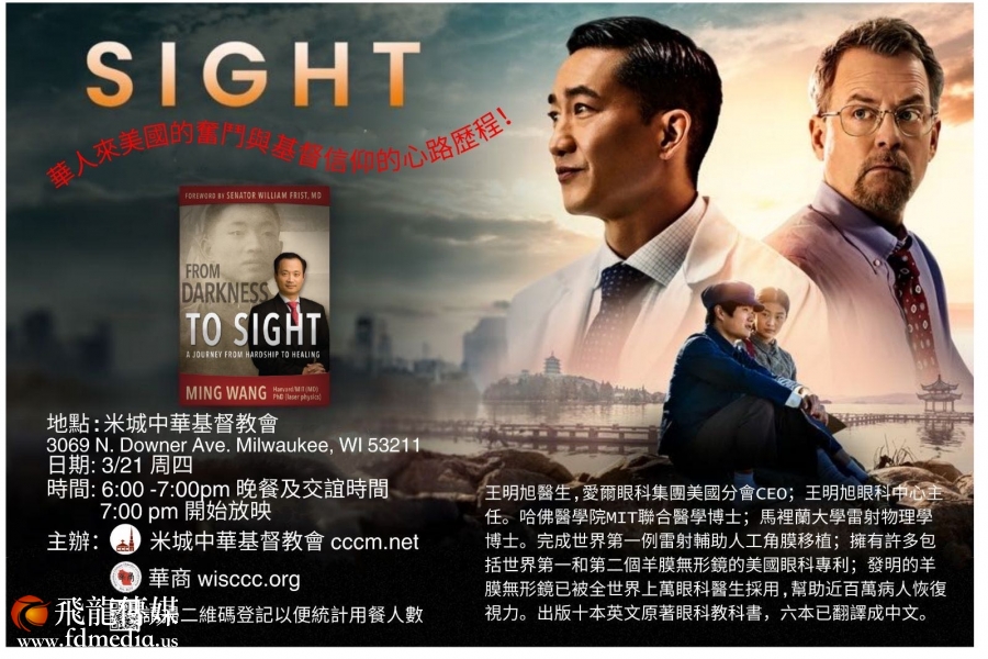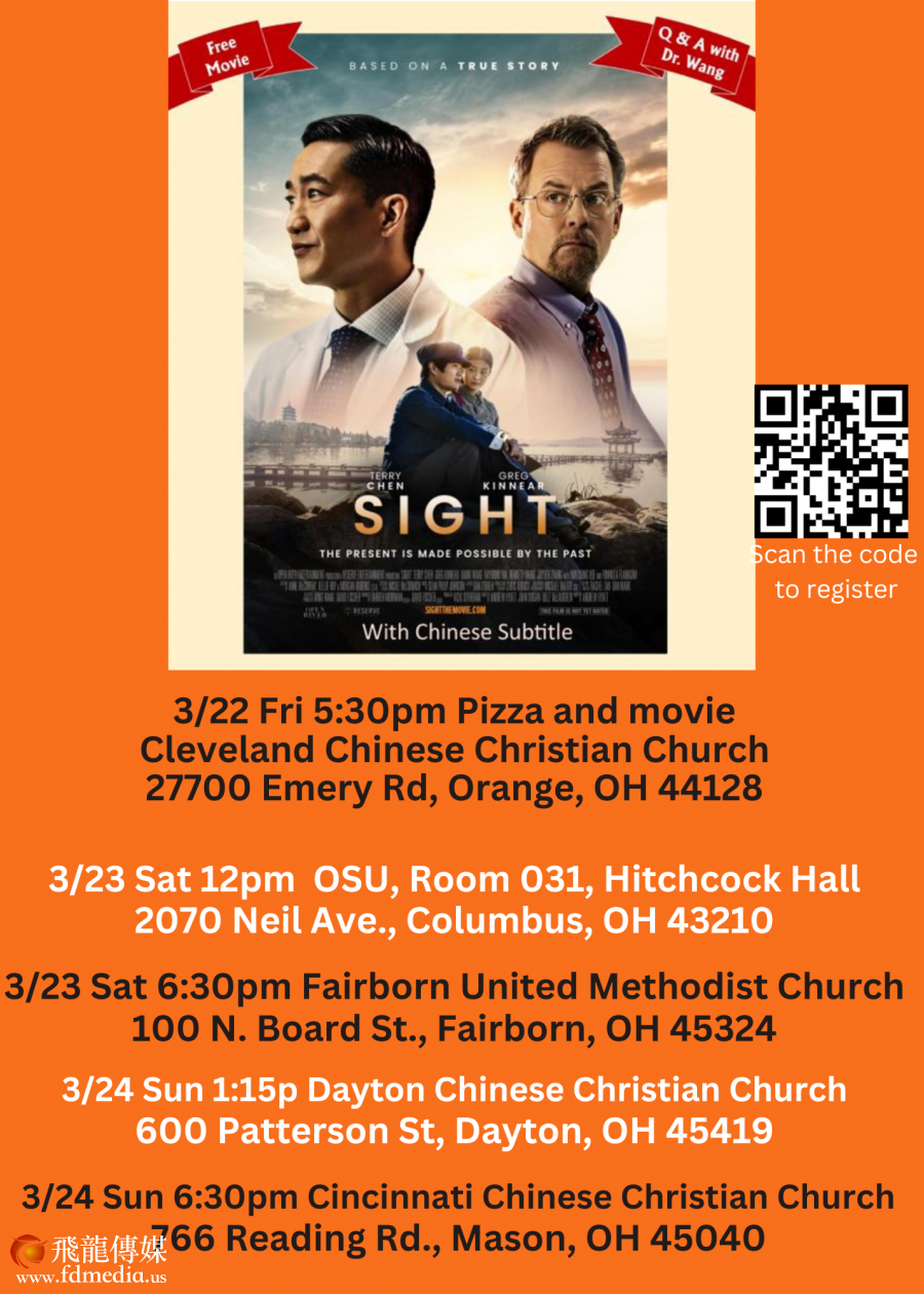 2024年3月22-24日,享誉美国的眼科手术医生王明旭和以他为原型的电影Sight即将到威斯康星和俄亥俄州地区,活动包括免费播放Sight 电影、见证、讲道并且和观众互动。 未来几个星期将会在中西部6州进行巡演:俄克拉荷马(Oklahoma)、圣路易斯(St Louis)、内布拉斯加(Nebraska)、爱荷华(Iowa)、维斯康星(Wisconcin)、和俄亥俄(Ohio)、为了方便英语不好的华人观众,从去年12月初波士顿巡演开始,Sight 电影就加上了中文字幕。这是一个非常重大的变化,使得英语没有那么好的华人观众有机会去看电影。
