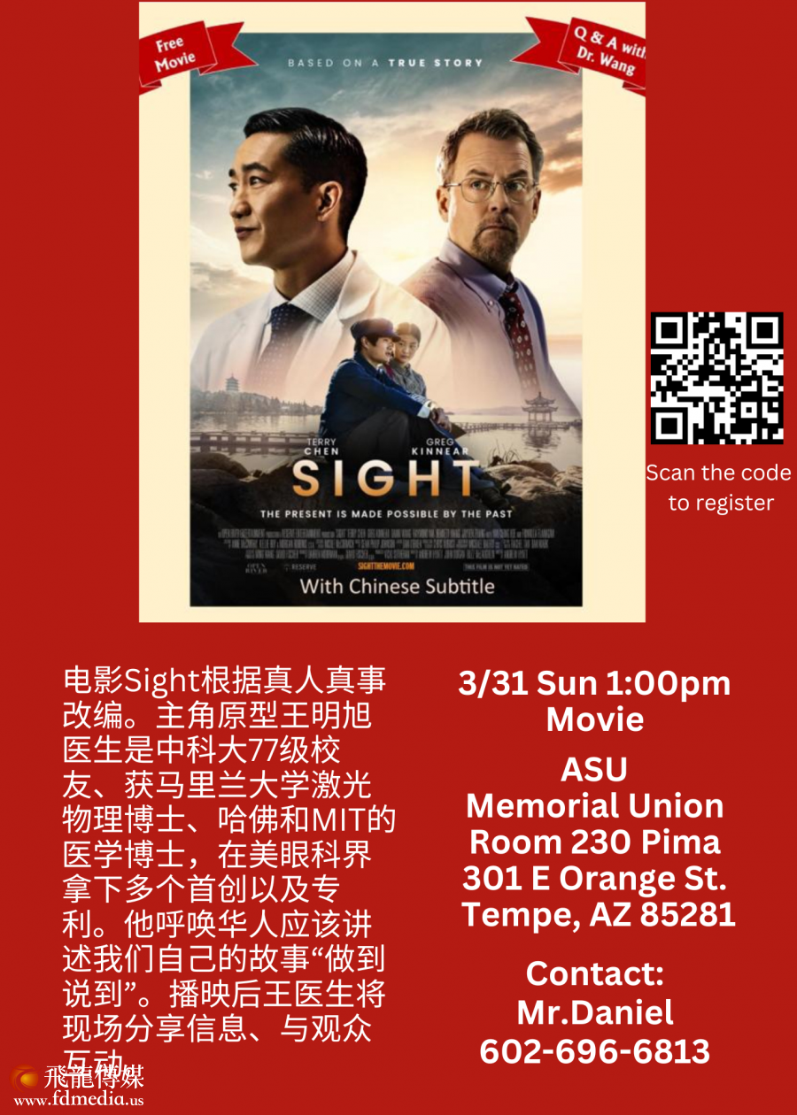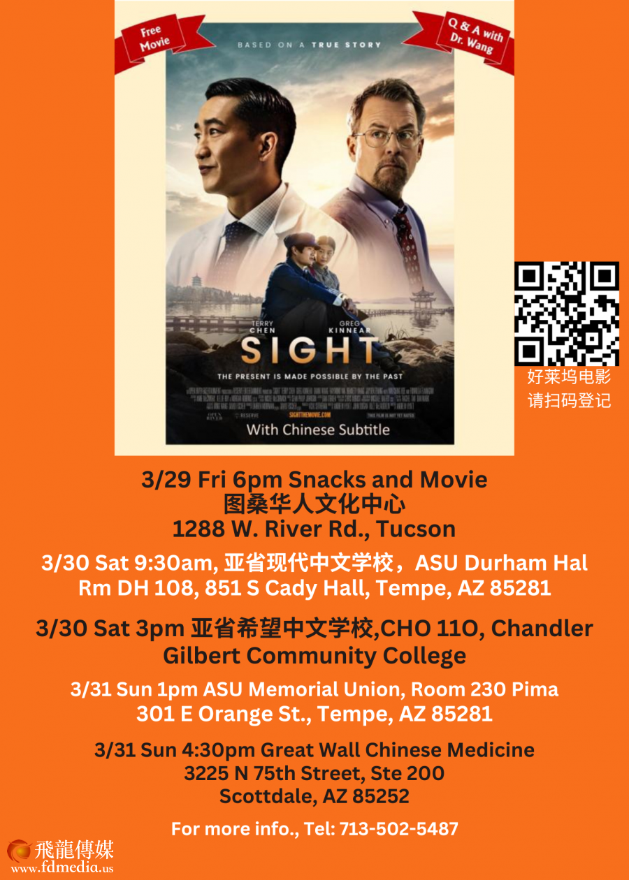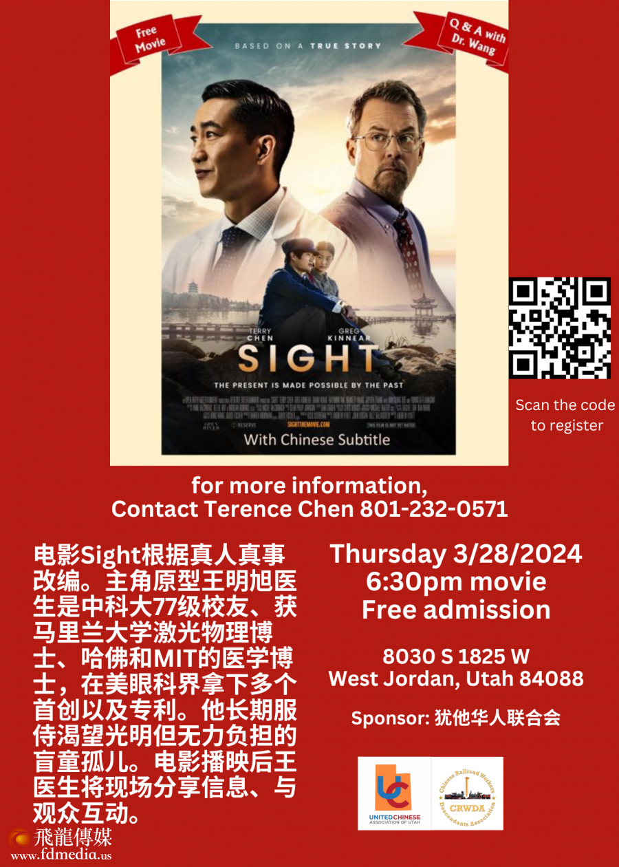 2024年3月28-31日,享誉美国的眼科手术医生王明旭和以他为原型的电影Sight即将到犹他州和亚利桑那州地区,活动包括免费播放Sight 电影、见证、讲道并且和观众互动。 为了方便英语不好的华人观众,从去年12月初波士顿巡演开始,Sight 电影就加上了中文字幕。这是一个非常重大的变化,使得英语没有那么好的华人观众有机会去看电影。