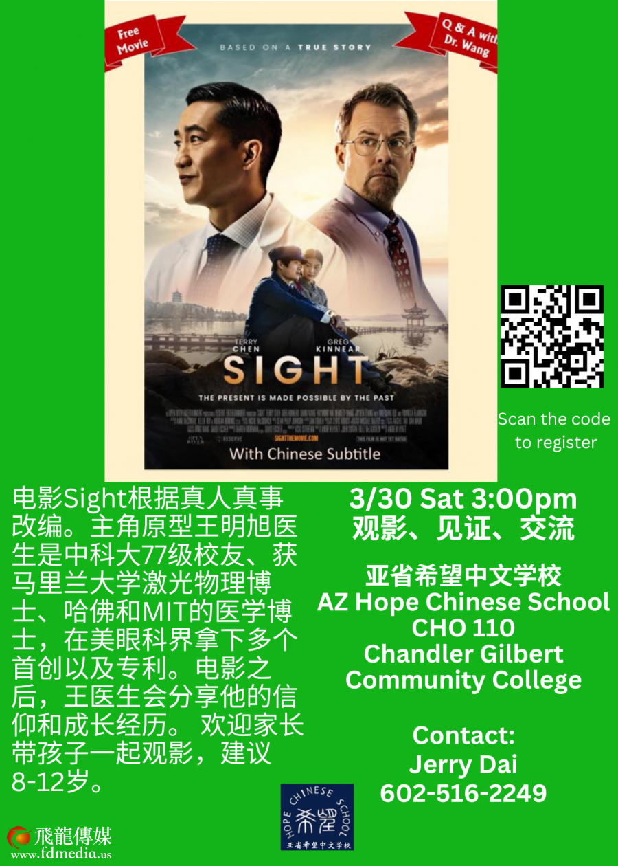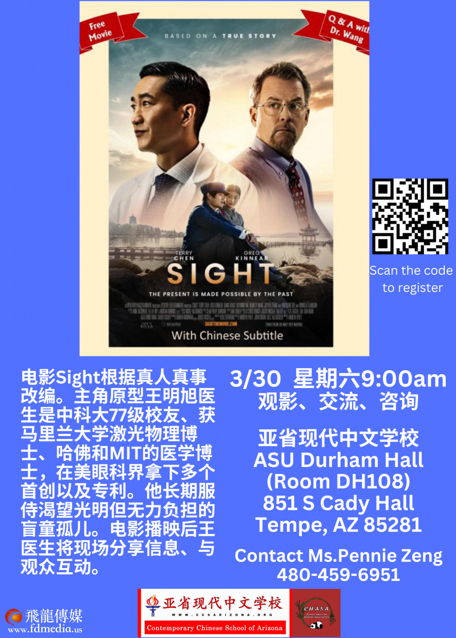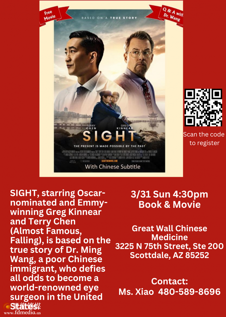 2024年3月28-31日,享誉美国的眼科手术医生王明旭和以他为原型的电影Sight即将到犹他州和亚利桑那州地区,活动包括免费播放Sight 电影、见证、讲道并且和观众互动。 为了方便英语不好的华人观众,从去年12月初波士顿巡演开始,Sight 电影就加上了中文字幕。这是一个非常重大的变化,使得英语没有那么好的华人观众有机会去看电影。