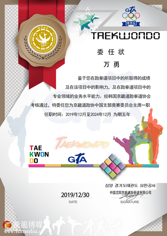 值得一提的是,2019年12月30日万勇先生因在跆拳道领域做出卓越贡献,经韩国京畿道跆拳道协会通过,特委任万勇先生出任京畿道跆协中国支部竞赛委员会主席一职。