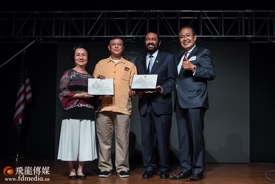 美国国会议员艾尔·格林(左三)向华星艺术团团长鲍玲(左一),杨万青(左二)和李蔚华(左四)颁发褒奖状