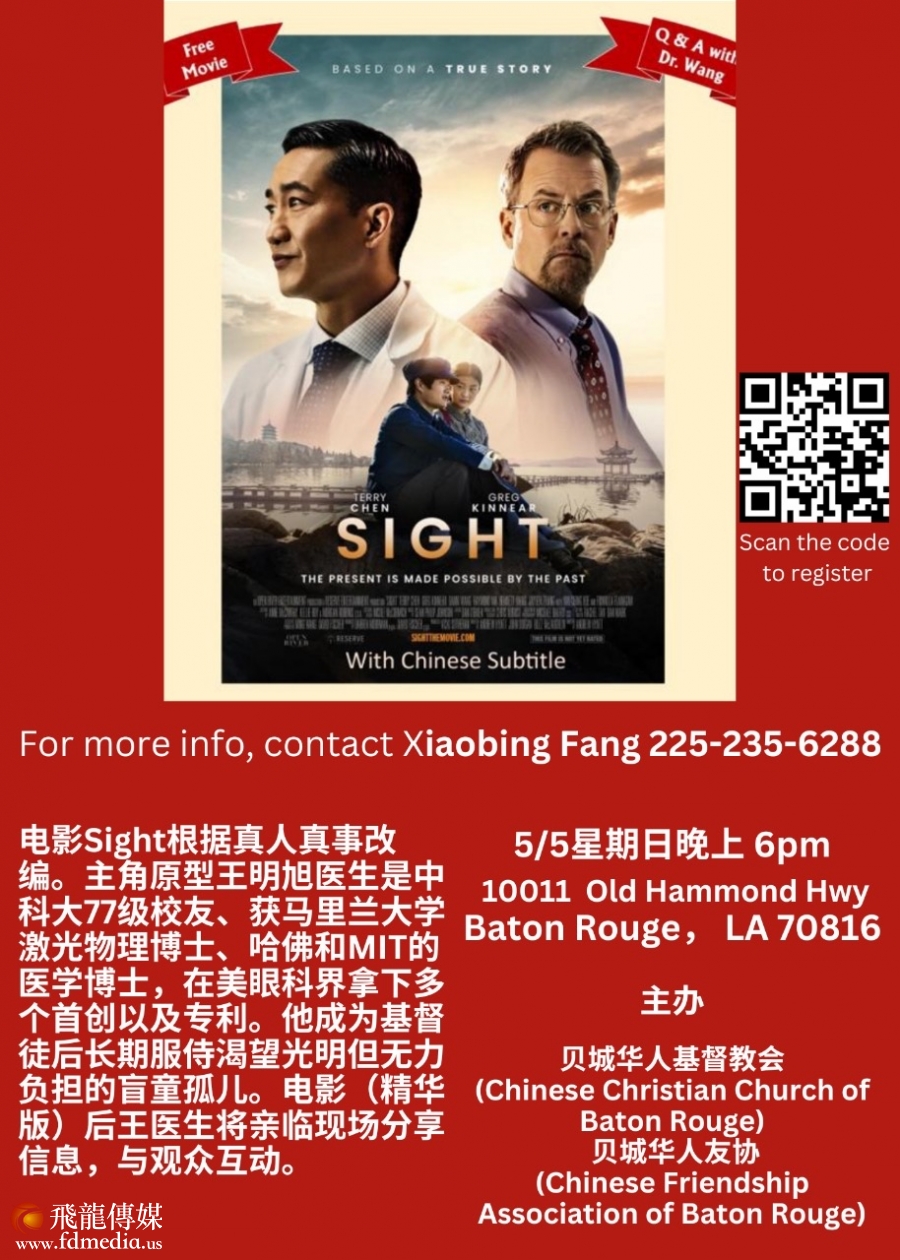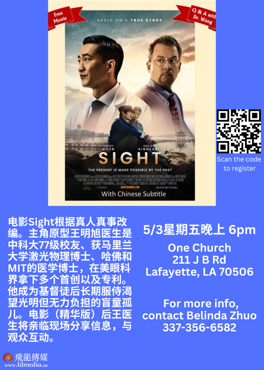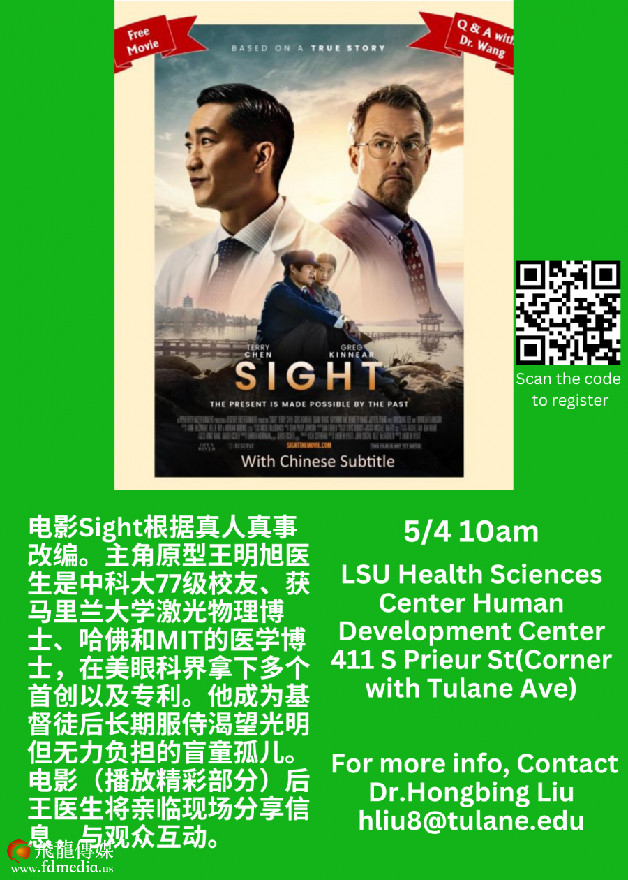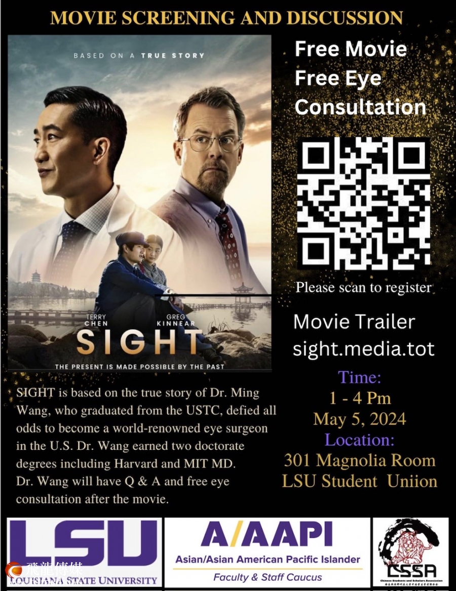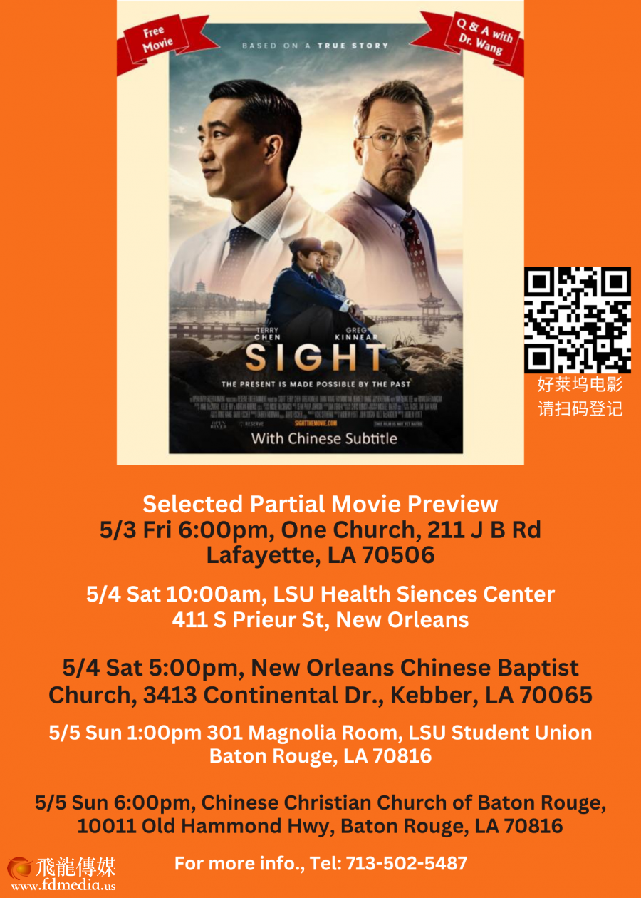 2024年5月3-5日,亚裔月的第一个周末,享誉美国的眼科手术医生王明旭和以他为原型的电影Sight的Sight 电影北美行即将到到达路易斯安那州举行5场和观众见面活动(详情见海报)。这是Sight 第一次到路州,也是全国行的倒数第二站。