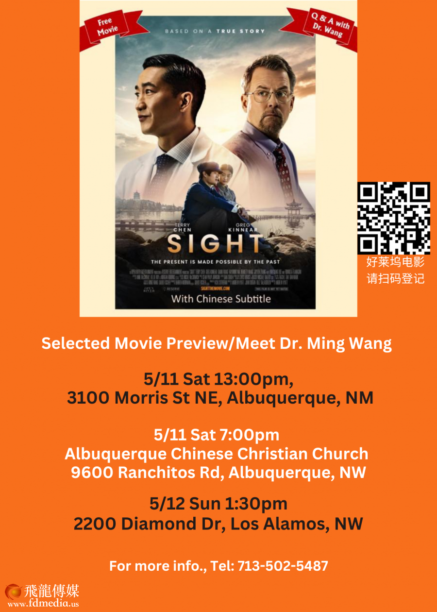 2024年5月11-12日,亚裔月的第二个周末,享誉美国的眼科手术医生王明旭和以他为原型的电影Sight的Sight 电影北美行即将到到达路易斯安那州举行5场和观众见面活动(详情见海报)。这是Sight 第一次到新墨西哥州,也是全国行的倒数第二站。
