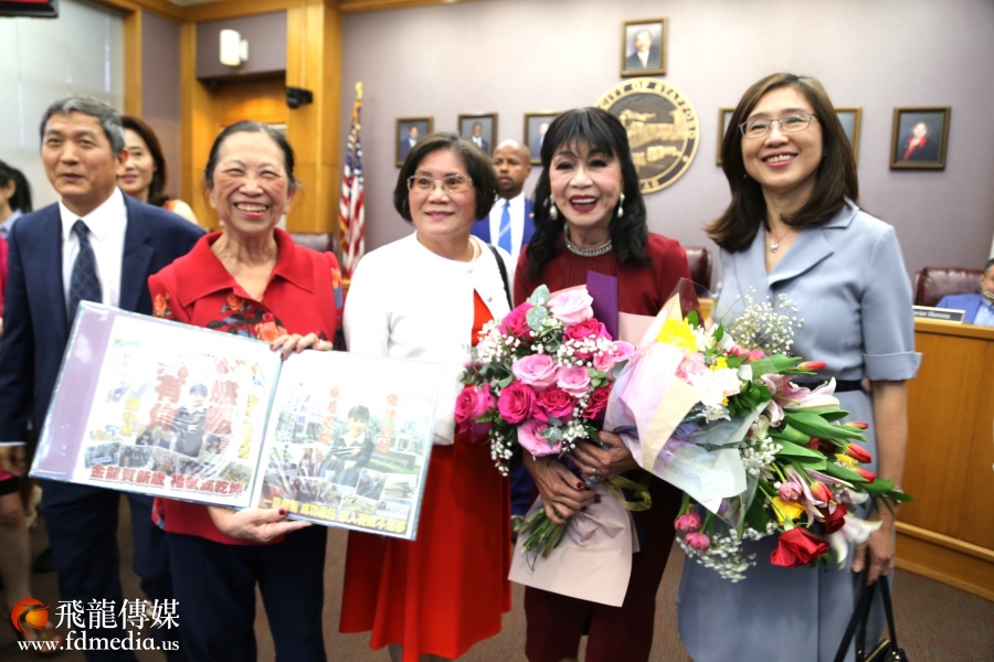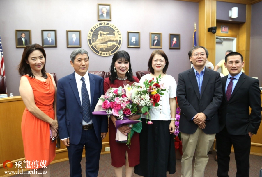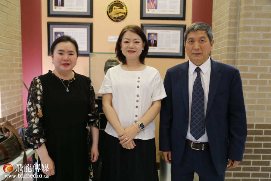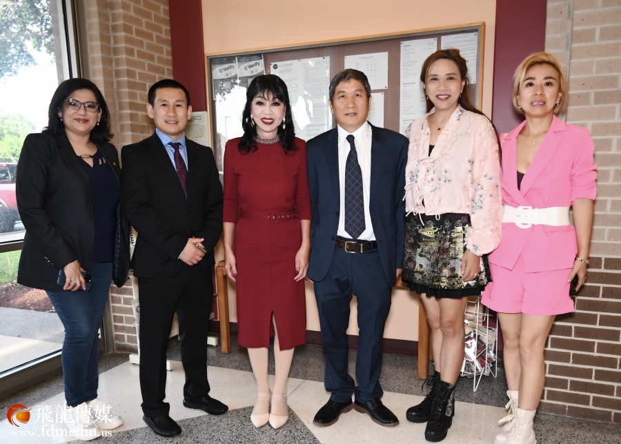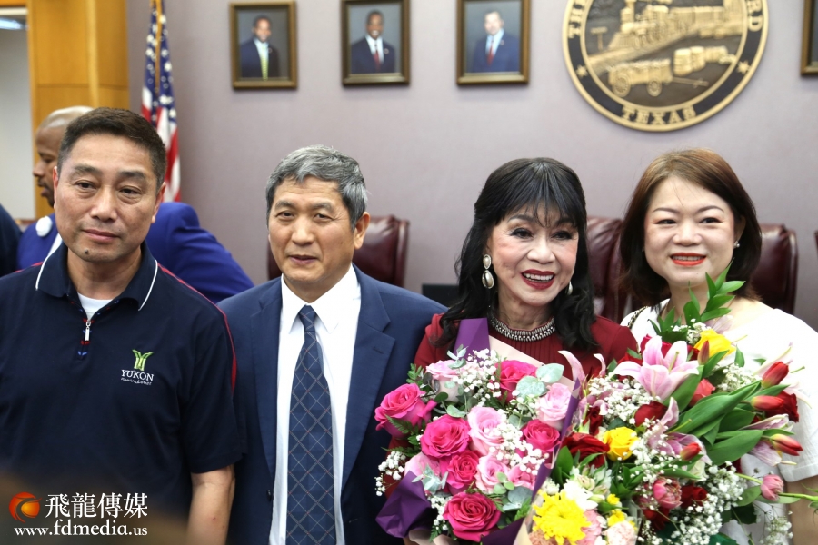 左起:飞龙传媒陈铁梅、谭秋晴市议员、休斯敦市长约翰·惠特迈尔 (John Whitmire) 助理GiGi Lee合影