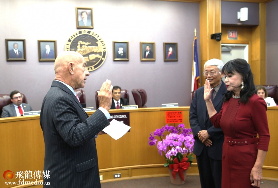 休斯敦市长约翰·惠特迈尔 (John Whitmire) 亲自到场主持谭秋晴市议员的就职典礼
