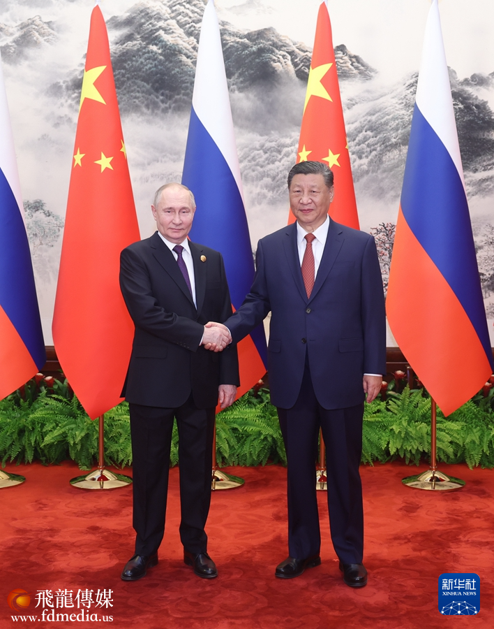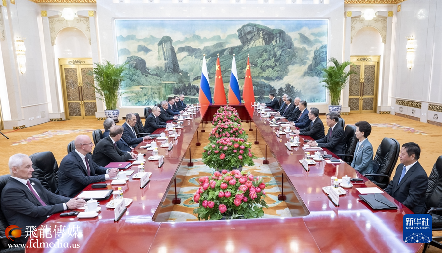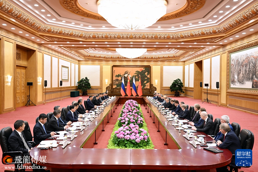 普京表示,我很高兴在就任新一届俄罗斯总统后再次访华。去年3月习近平主席也在连任后不久即对俄进行国事访问。这是我们两国的友好传统,表明双方对加强新时代俄中全面战略协作伙伴关系的高度重视。今年是中华人民共和国成立75周年,也是俄中建交75周年,值得我们共同庆祝。发展俄中关系不是权宜之计,不针对第三方,有利于国际战略稳定。俄方愿同中方持续扩大双边合作,密切在联合国、金砖国家、上海合作组织等框架内沟通协作,推动建立更加公正合理的国际秩序。