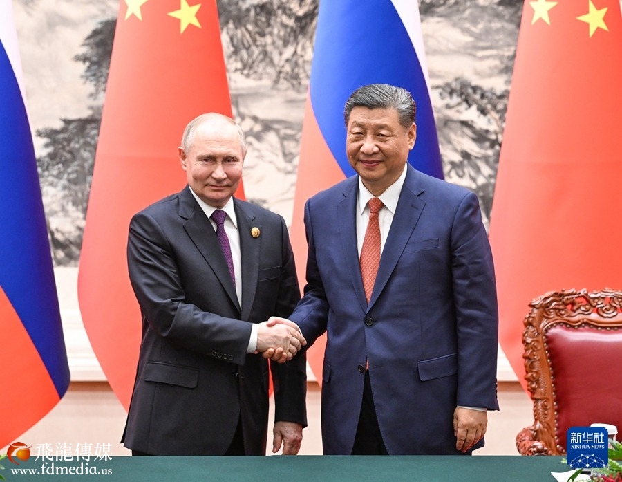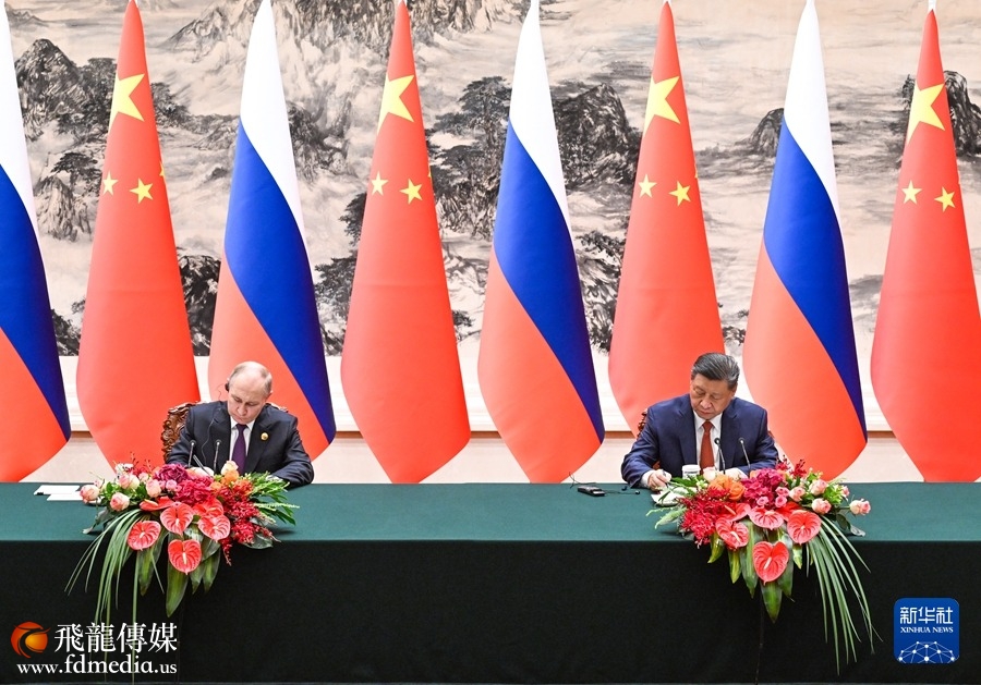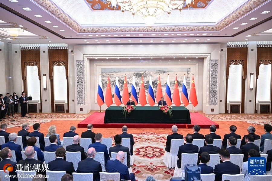 5月16日上午,国家主席习近平在北京人民大会堂同来华进行国事访问的俄罗斯总统普京举行会谈。这是会谈后,两国元首共同签署并发表《中华人民共和国和俄罗斯联邦在两国建交75周年之际关于深化新时代全面战略协作伙伴关系的联合声明》。新华社记者 饶爱民 摄