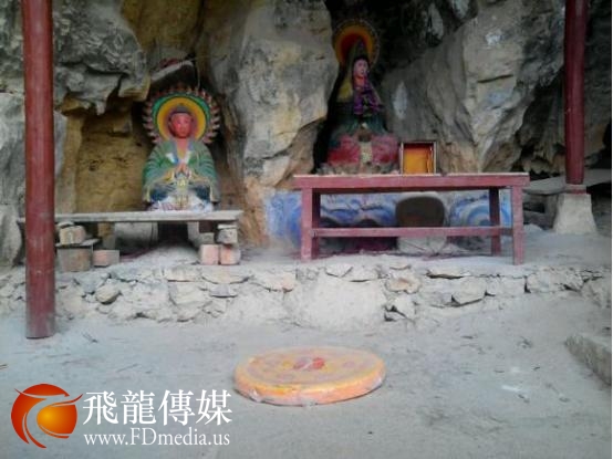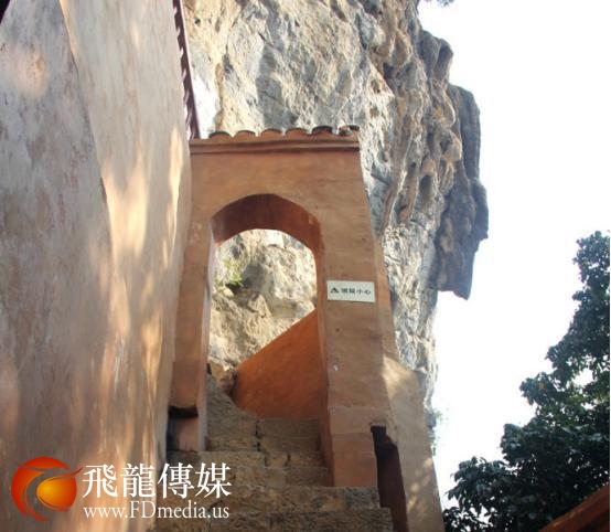 万福寺在山峰石壁架设一座云梯天桥上下,跨空曲环,叠层而上,险中有险,奇上加奇。虽经300多年之久,仍固若金汤。沿着云梯攀登,凭栏远眺,群峰竞秀,碧水萦洄。朝下看则足底生云。洞顶右侧石壁上,刻有“南疆永固”四个大字,在山前公路上远远望去,赫然入目。后面山壁,断壑斜晖,倒树外垂,清风拂面,凉爽清幽,犹仙境也。洞顶内乳石倒挂,犹如盏盏天灯,为游人照明。