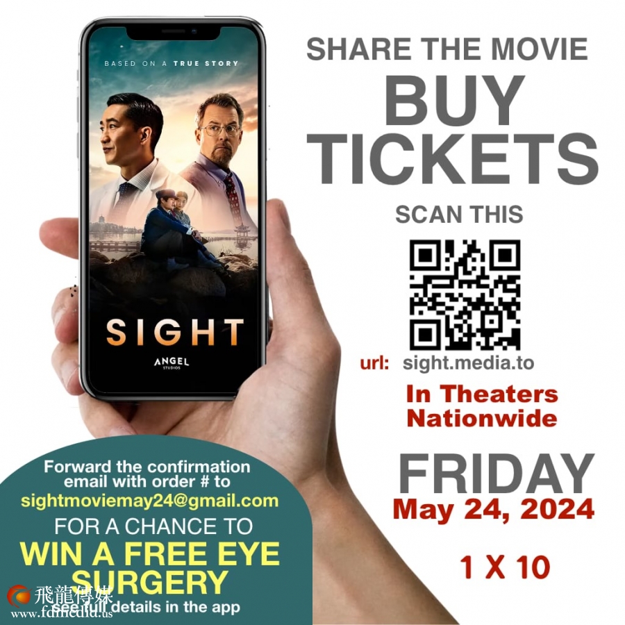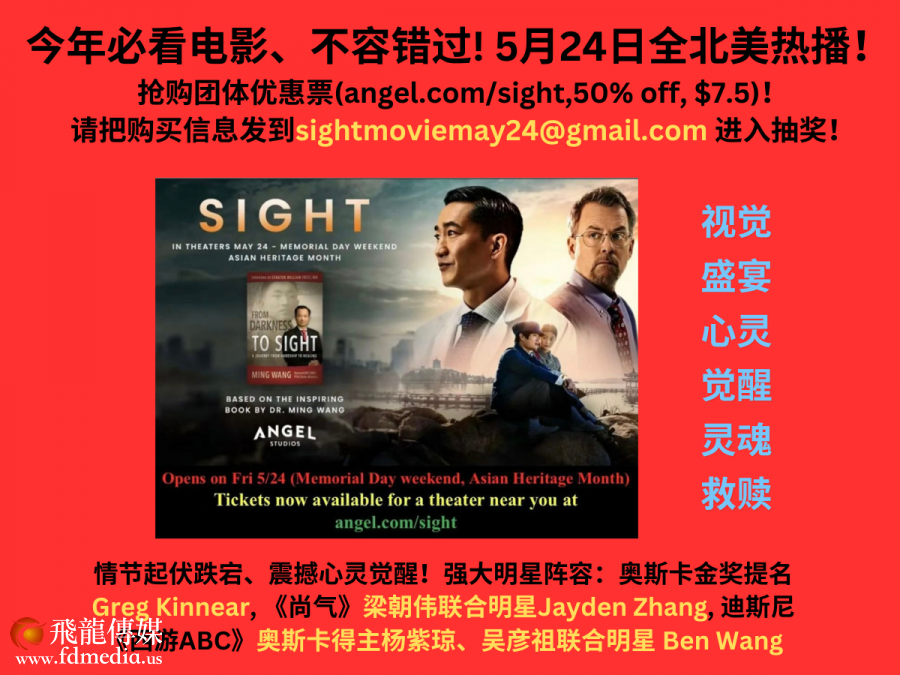 千呼万唤始出来的Sight 电影终于要在5月24日即将与全美观众见面。 Sight获得ICVM 最大奖Best Picture, Heartland 电影节最佳影片。最近又有新闻,奥斯卡评选委员会会集体观看Sight。对于华人华裔来说,Sight电影让5月24日这个周末成为让华裔骄傲(Chinese Pride)的周末!