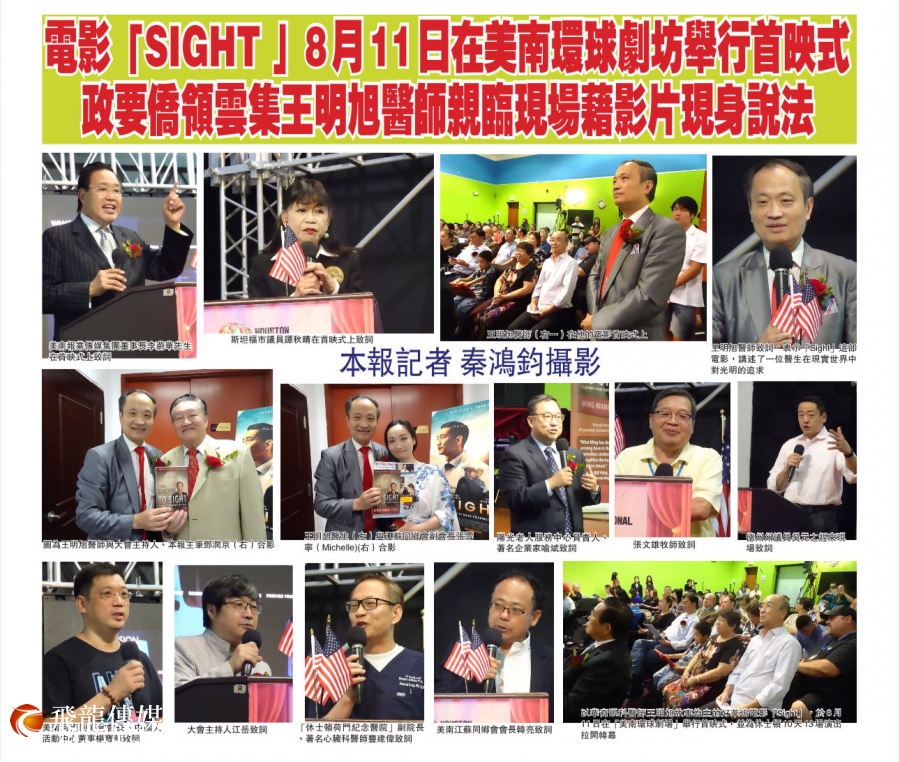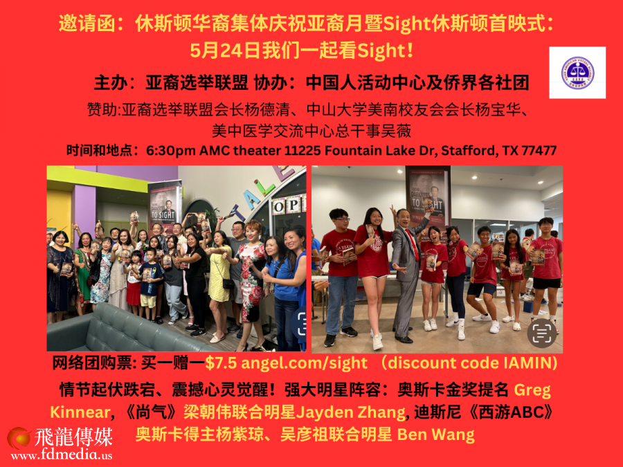 5月24日星期五晚上6:30pm 由亚裔选举联盟主办、中国人活动中心和侨界各社团协办的主题为“华裔集体庆祝亚裔月暨Sight电影休斯敦首映式”活动即将拉开帷幕,活动鸣谢中国人活动中心董事长范玉新医生的大力支持和各同乡会会长支持。此次活动由亚裔联盟会长杨德清、中山大学美南校友会会长杨宝华以及美中医学交流中心创始总干事吴薇赞助支持。这次活动是休斯敦华裔号召全国观众在5月24日本周末电影大选中投票“Sight”--讲我们的故事(Tell Our Stories)--让华裔有机会在好莱坞发声的重要活动。