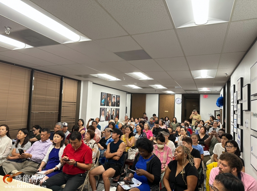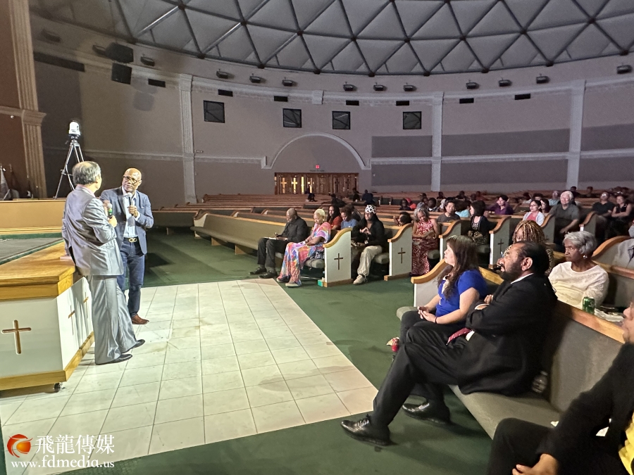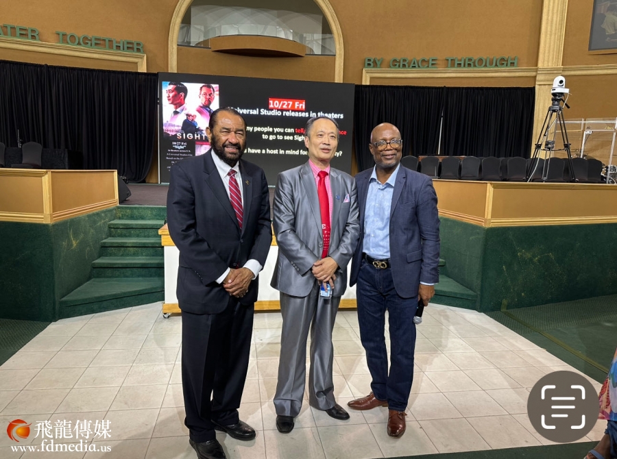 休斯敦Community of Faith Church 教会牧师兼哈里斯郡运动中心(NRG)董事长 James Dixon II 以及观影现场(VIP国会议员AL Green 和休斯敦联合校友会前会长黄华女士出席)