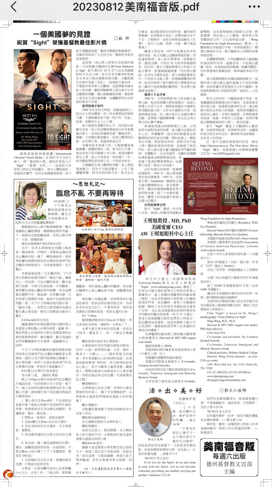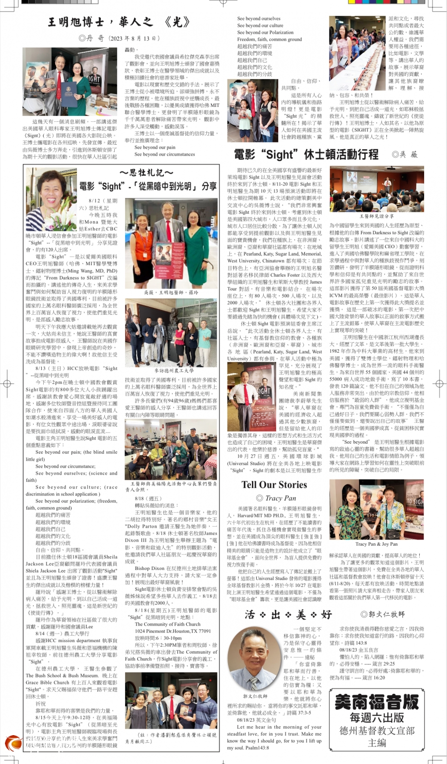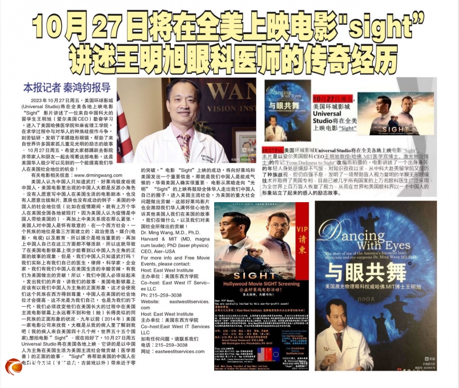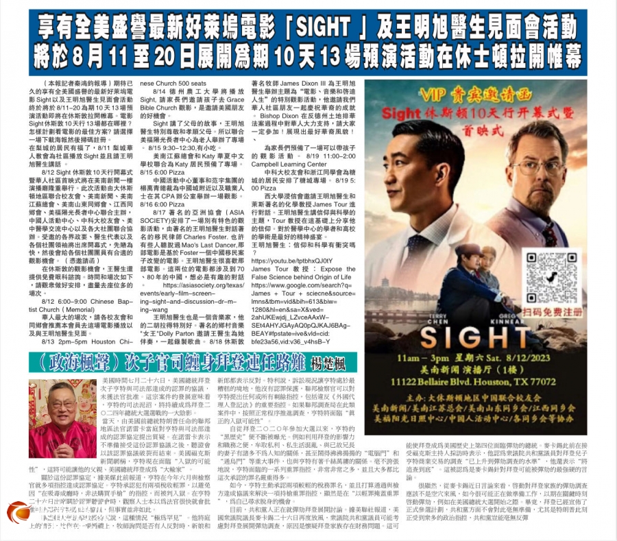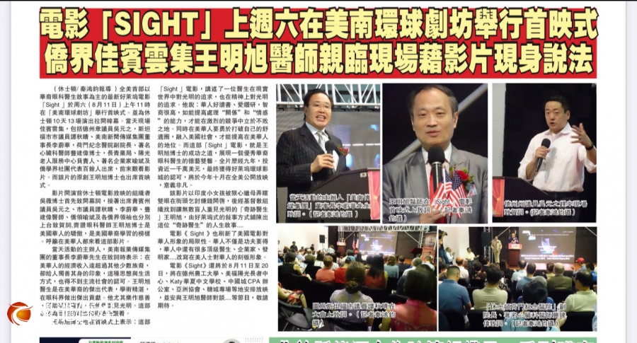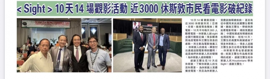 千呼万唤始出来的Sight 电影终于要在5月24日即将与全美观众见面。 2023年5月19 日,电影主人公王明旭医生带着Sight 电影从纽约开始了美国首场华人社区“观影宣传”活动。 2023年8月11日-20日,王明旭医生应美中医学交流中心创始总干事吴薇博士的邀请来到休斯敦,进行了为期10天14场的宣传活动,从社区到大学、商会,从中文学校到老人中心,从国会议员到普通移民,从7岁的孩子,到93岁的老人,从华人华裔的基督教堂到非洲裔、欧洲裔美国教堂, 各界大约3000人“破纪录”地参与了Sight 电影的观影活动。 休斯敦是全美对Sight进行最多宣传活动的城市。
