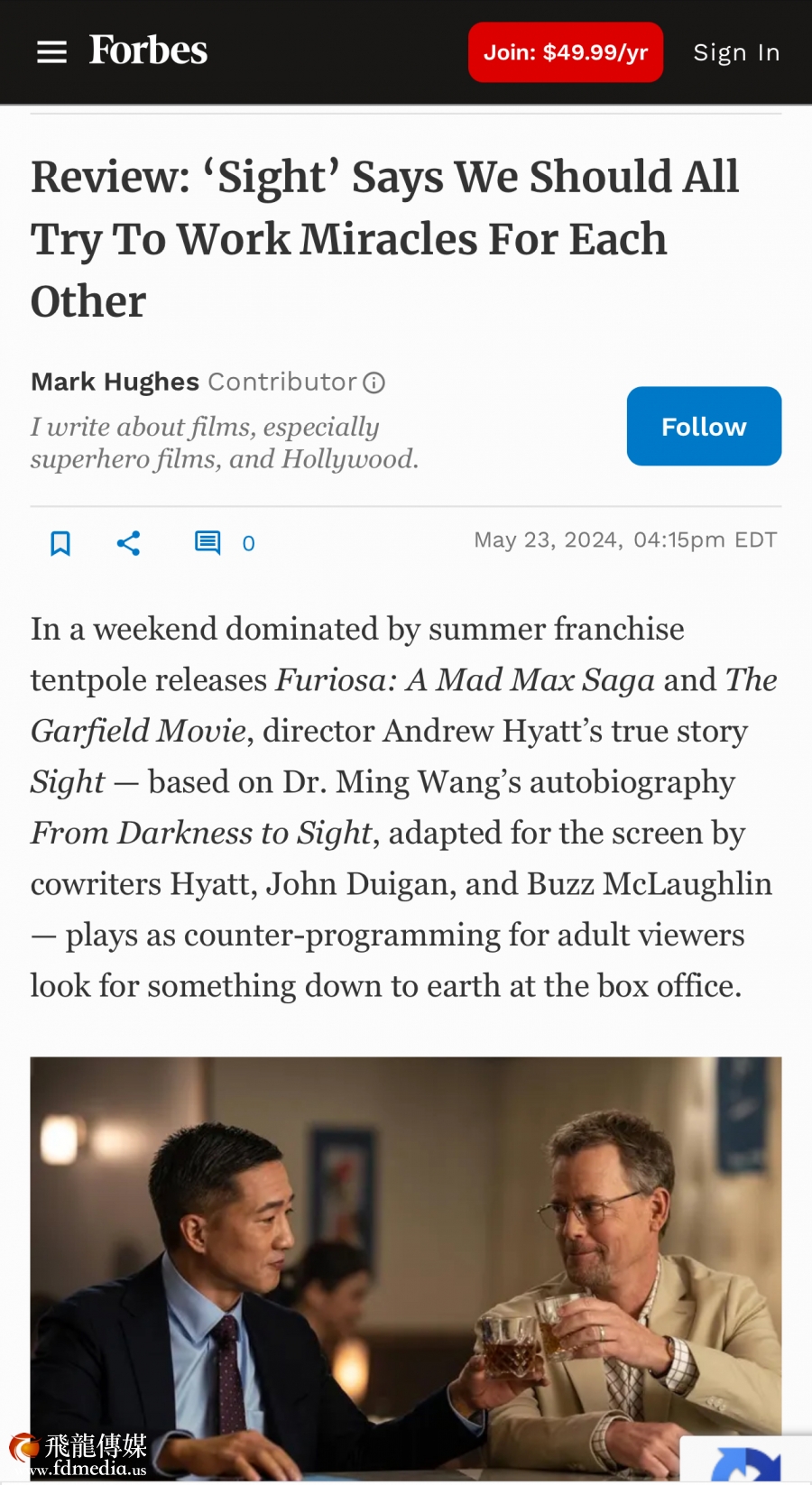 2024年5月24日是Sight 电影与美国观众见面的日子。 这两天,喜讯频传! 继美国主流媒体纽约时报(New York Times)发了对Sight的影评以后,福布斯(Forbes)也发评论对Sight给与更高评价! 主流媒体对Sight的关注让华人社区在这个5月感到额外的”温暖“,毕竟这是一个为亚华裔建立的传统月。 个人观点,福布斯Mark 比纽约时报Glenn对Sight电影的理解更加深入一些。所以本文详细介绍一下福布斯对Sight 的评论。
