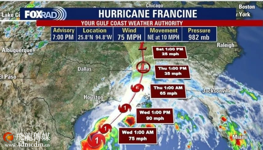 美国国家海洋气象局报道, 弗朗辛Francine在向北推进并迅速从热带风暴爆发为飓风。最新预测到本周三晚 7 点, 这场升级为飓风的弗朗辛Francine将绕过休斯敦袭击路易斯安那州海岸最大持续风速将达到每小时 75 英里。美国国家气象局高级气象学家珍妮丝·马尔多纳多表示, 强风和海平面上升可能会导致危险的水况。今天将是它离我们最近的一天。截至周三下午, 布拉佐里亚县、钱伯斯县、加尔维斯顿县和马塔戈达县都发布了风力警告。