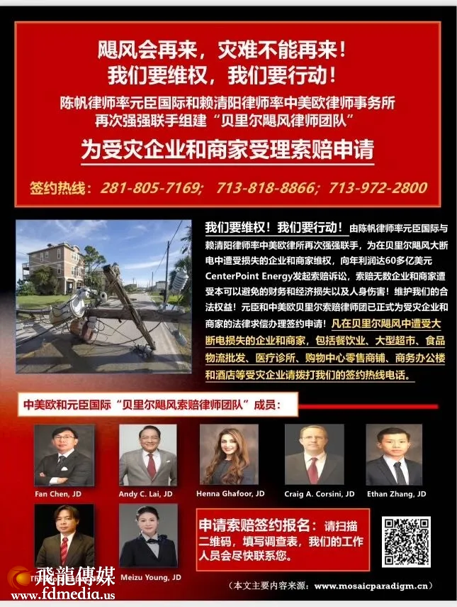 在此,陈帆律师和赖清阳律师率“贝里尔飓风律师团队”再此呼吁: 飓风会再来,但大停电之灾难不能再现!我们为在贝里尔飓风大断电中遭受损失的企业和商家维权,向年利润达60多亿美元CenterPoint Energy发起索赔诉讼,索赔无数企业和商家遭受本可以避免的财务和经济损失以及人身伤害!维护我们的合法权益!请尽快找元臣和中美欧贝里尔索赔律师团为您的受灾企业和商家求偿办理签约申请!凡在贝里尔飓风中遭受大断电损失的企业和商家,包括餐饮业、大型超市、食品物流批发、医疗诊所、购物中心零售商铺、商务办公楼和酒店等受灾企业,请拨打我们的签约热线电话281-805-7169;713-818-8866;713-972-2800。
