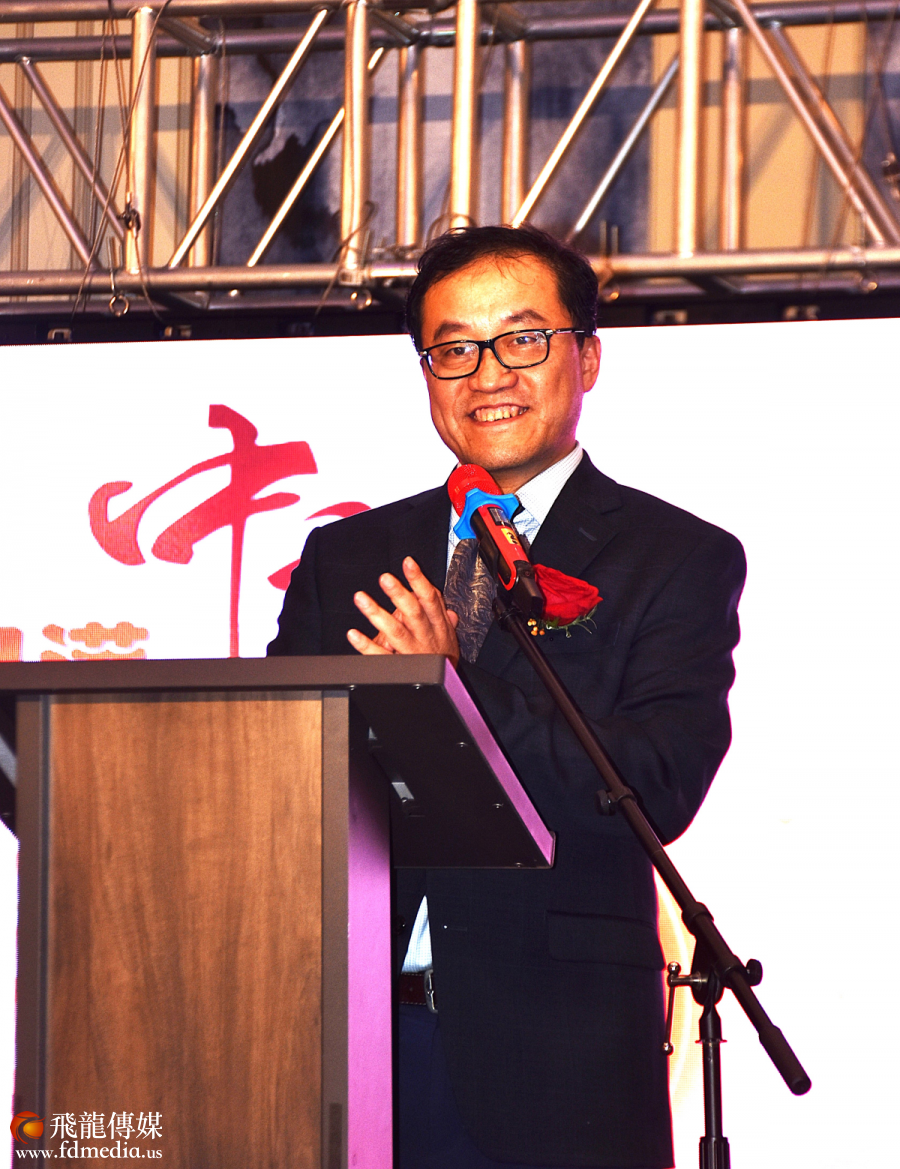 中国驻美大使馆董传杰参赞在致辞中宣读了中国驻美大使谢锋的贺函。谢锋大使在信中提到,今年是中美建交45周年,尽管两国关系经历了风雨考验,但中美关系始终在前行。他强调,华裔为中美两国人民的福祉以及世界和平、稳定与繁荣做出了巨大贡献,期望华侨继续发挥桥梁作用,推动两国关系的稳定与发展。