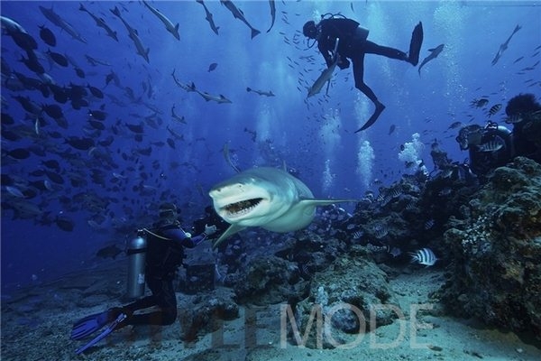 斐济塔维瓦岛(Tavewa Island)的Cathedral Reef,不仅特别适合潜水,更适合在水中和鲨鱼一起游弋。这里是世界上最好的与鲨鱼共舞的海域之一。这里生活着虎鲨、白鳍鲨、猫鲨、锤头鲨、牛鲨等等。灰色的礁石中还穿梭着各种五颜六色的海洋生物。