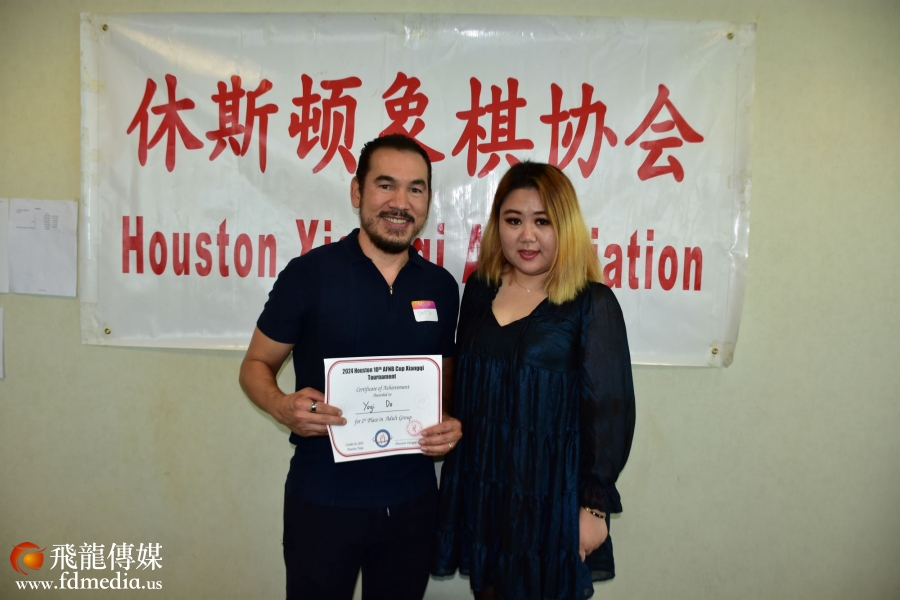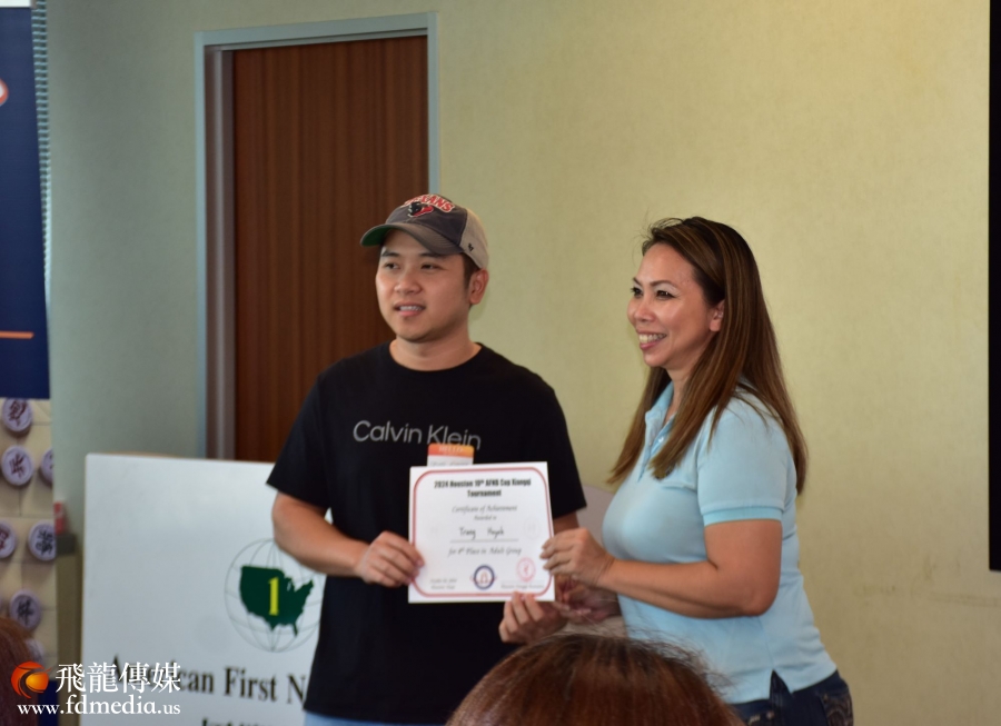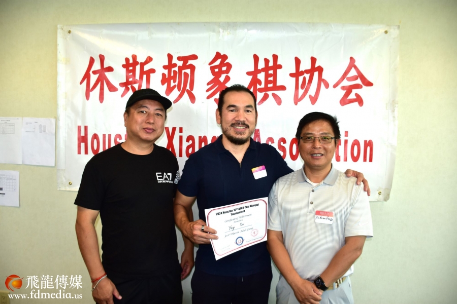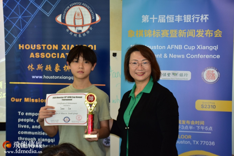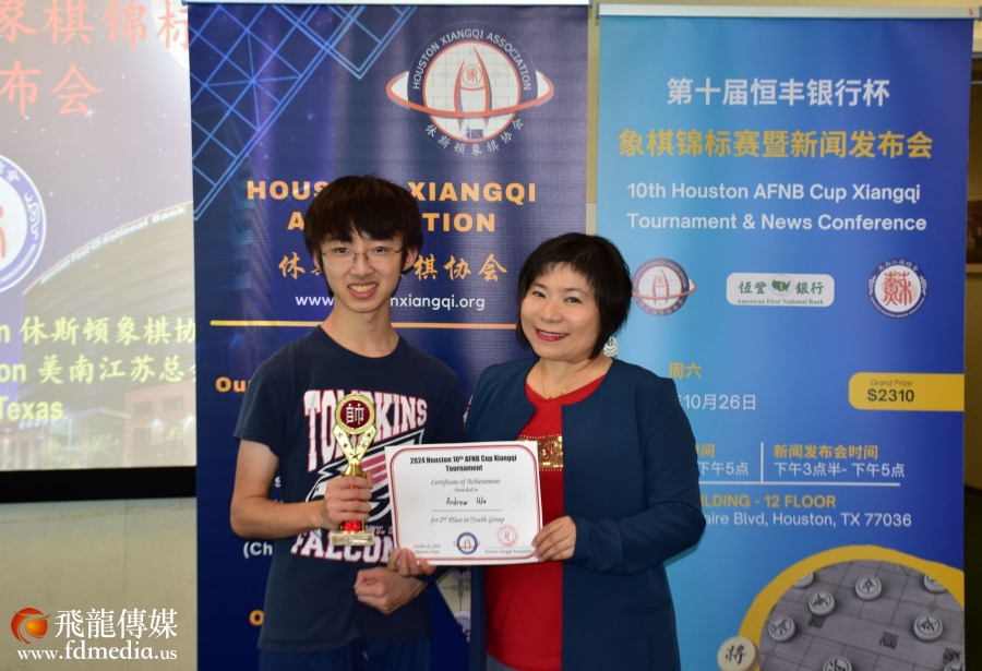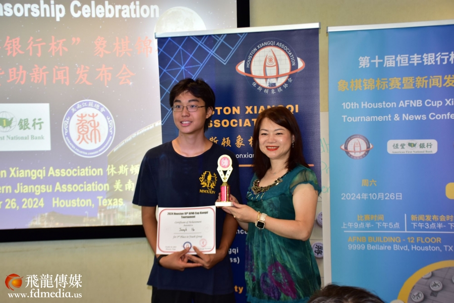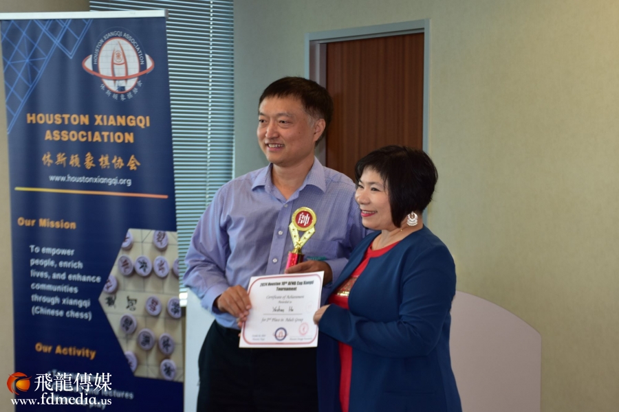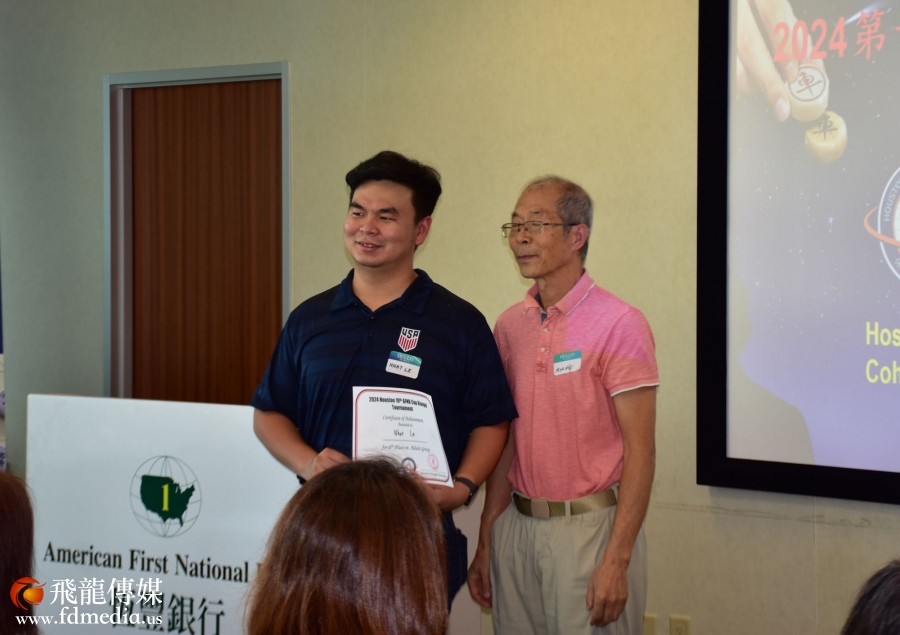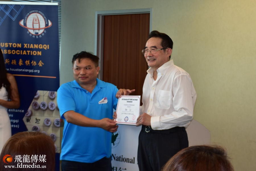 恒丰银行公关部经理Jennifer Zhou ,国会议员Troy Nehls的亚裔代表张晶晶,休斯顿象棋协会主席胡玉山,副主席徐建勋,出席了闭幕式,中国人活动中心董事长范玉新、执行长陈皙晴,前执行长方一川,副执行长张经坤,美南江苏总会会长韩亮、副会长张雪宁,中国人活动中心董事杨德清、知青协会前会长沈德渝,越南科学与文化协会董事长Thanh Le,梨城华人协会会长田华等应邀出席了闭幕式,并为获奖棋手颁奖。周明洁代表恒丰银行对比赛的成功表示祝贺,对象棋协会推广中国传统文化工作表示肯定,重申了恒丰银行对象棋社团活动大力支持的态度,并祝愿恒丰杯象棋赛越办越好。