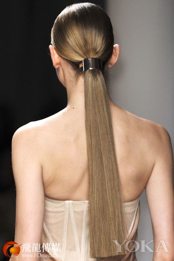 有很多抹胸、露肩款式的婚纱都适合搭配马尾辫,但是马尾发型好像没有太多发饰可以搭配。不要担心,参考秀场上的模特们,极简风也可以被运用到婚礼造型中。像这样顺滑的极简马尾辫,用一只光泽感强的金属环束住,风格、气场就全有了。