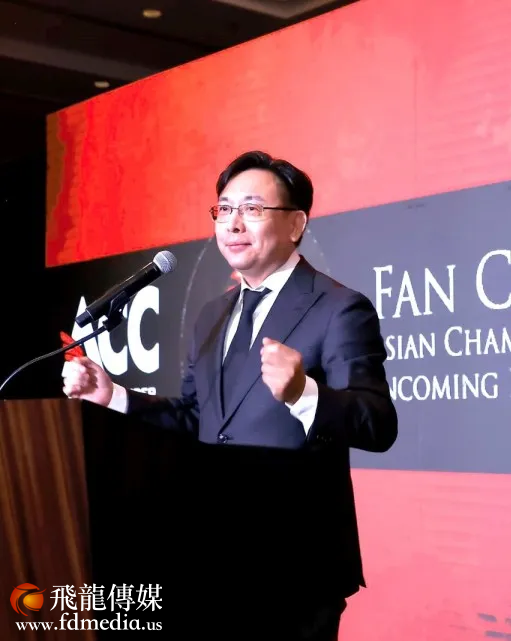 当主持人Jonas Chin宣布陈帆律师将担任ACC 2025-2026年新任理事会会长,从现任越南裔女会长手中交棒,引起全场欢声雷动。陈帆律师在一片热烈的掌声中闪亮登场,并发表感言,也是当晚最后的闭幕词。他说:晚上好!在这充满活力和温馨的夜晚,我很荣幸站在这里,作为新任ACC理事会会长,与你们共同庆祝本次年度企业家精神奖颁奖典礼。感谢大家的到来,让这个夜晚更加意义非凡。陈帆会长引用了休斯敦市长John Whitmire以及联邦众议员Al Green最近针对亚裔社区对休斯敦的重大贡献的讲话,同时号召所有亚裔商业界精英要与其他族裔、其他组织、美国联邦、州和地方政府多交流,多合作,将引领亚商会700多名企业会员,迈入一个充满发展机遇的新时代。