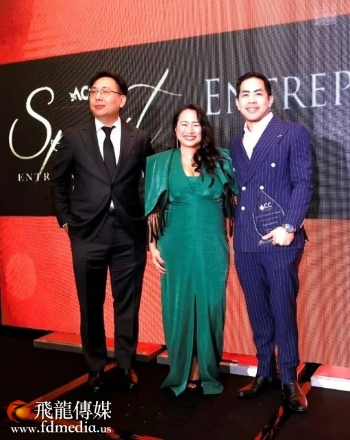 图:ACC现任会长May Wang和新任会长陈帆与获奖者年度企业家-Washington Ho合影