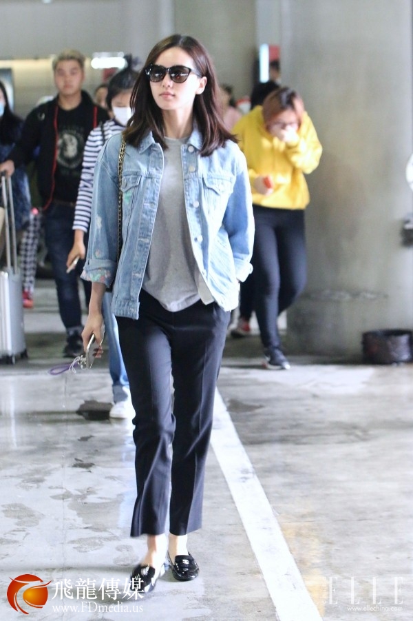 近日,刘诗诗现身机场。她身穿蓝色牛仔夹克,内搭灰色圆领T恤,下穿藏蓝色休闲九分裤,脚踩Chanel黑色漆皮亮钻乐福鞋。一条清爽九分裤瞬间感觉到入夏啦!