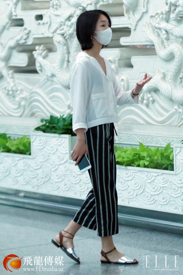 周冬雨更为休闲,身穿白色深V衬衫,下穿黑色条纹九分裤,脚踩金属色绑带平底凉鞋。