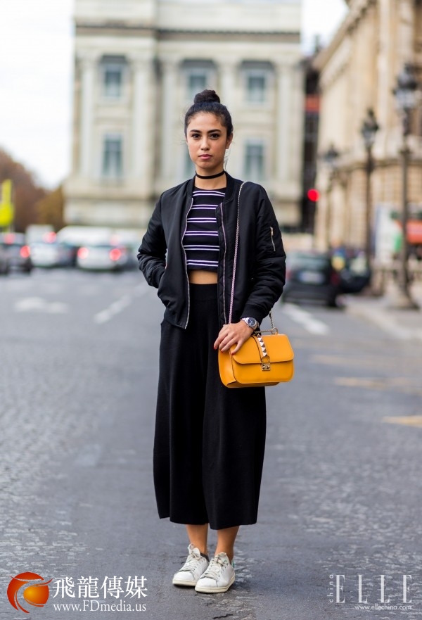 平底鞋卦的妹子通常把九分裤当做休闲裤来穿,搭配CROP-TOP或者飞行员夹克都不错。但天气渐渐转热,单独的一件纯色TEE搭配高腰九分裤的效果会更佳。