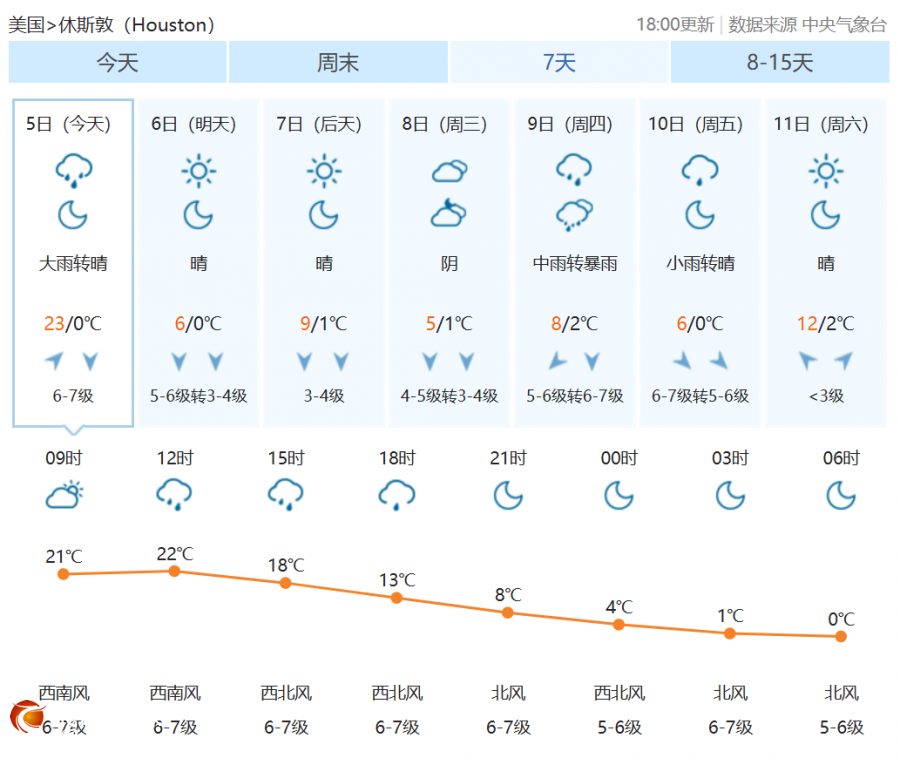 根据气象局的信息,随着冷空气进入休斯顿,今天(星期日)预计将有强至严重的风暴及龙卷风警报持续至下午 6 点。并在未来持续的一周内出现摄氏零度以下的低温情况。