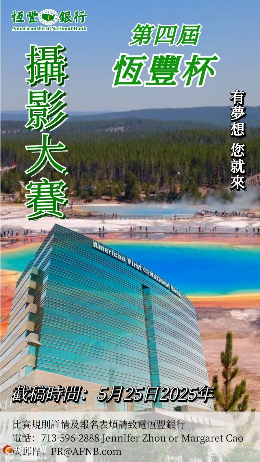 8.所有參賽作品,需提供相關尺寸的列印作品和電子文檔,並在截至日前,將電子圖片發送到郵箱:pr@afnb.com 。並同時將參賽作品按相關尺寸列印後郵寄或送至恒豐銀行大樓一樓大廳,地址: 9999 Bellaire Blvd ,Houston TX 77036。收件人:Jennifer Zhou。電話:713-596-2888。所有參賽者的參賽資格,已收到列印圖片為准。