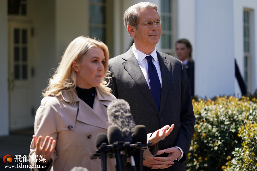 4月9日,美国财长贝森特(右)和白宫新闻发言人莱维特在白宫记者会上谈关税问题。(路透社)