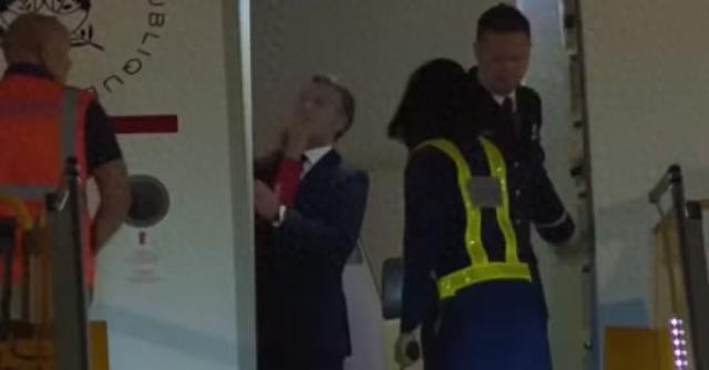 在下飞机的过程中,布丽吉特没有像以往一样挽住马克龙的手臂,而是扶着舷梯扶手走下了飞机。