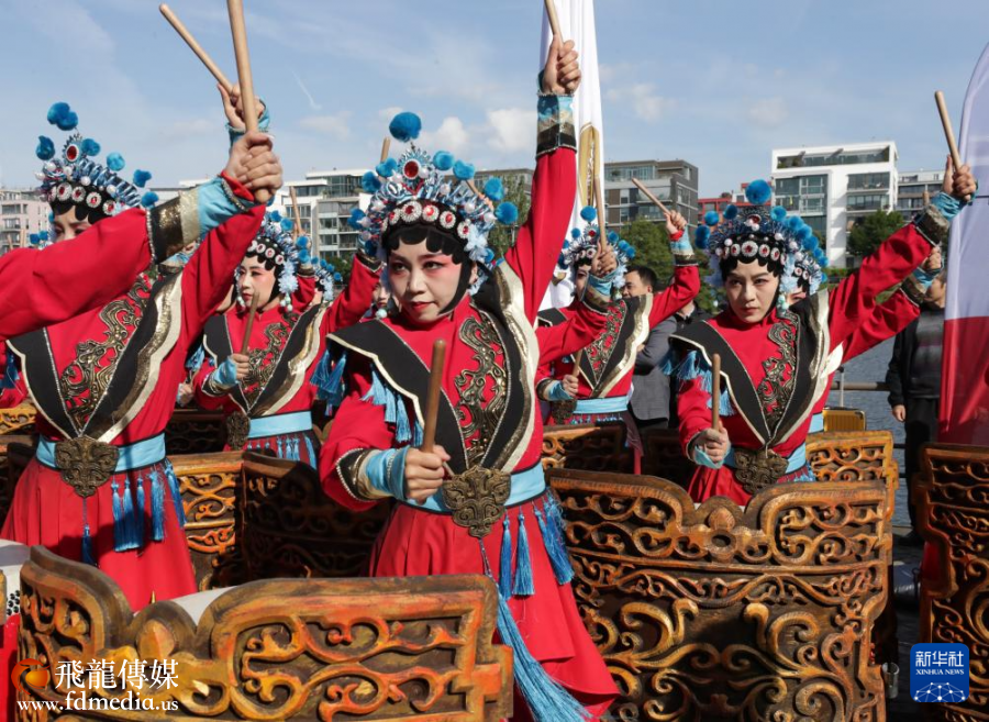 5月24日,中国陕西神木杨家将战鼓在德国法兰克福国际龙舟友谊赛期间表演。