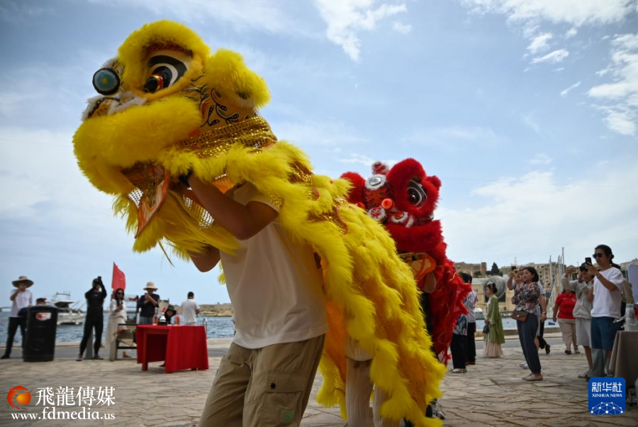 这是5月24日在马耳他比尔古拍摄的舞狮表演。